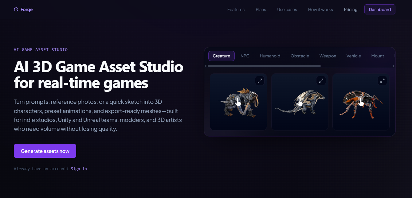 Forge is an AI-powered 3D asset generator for game developers. Turn prompts or sketches into fully-rigged, animated characters with multiple skins and variants, then export exactly what you need in a ZIP — saving hours of modeling and animation time.