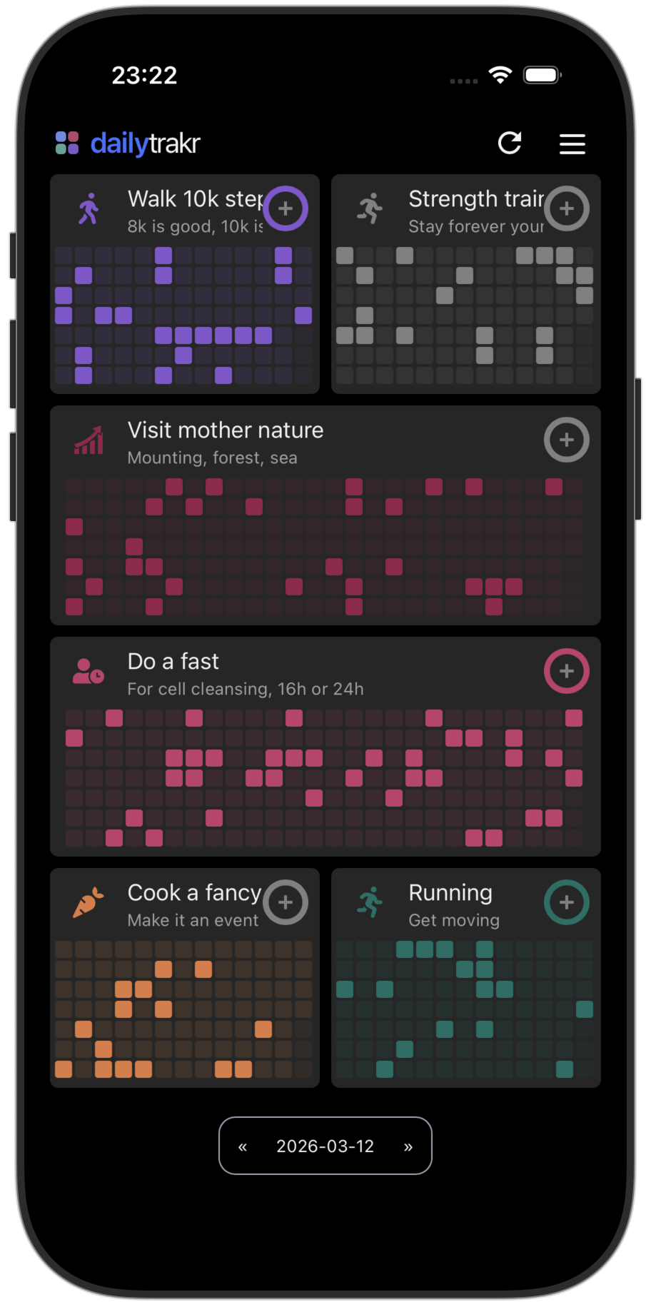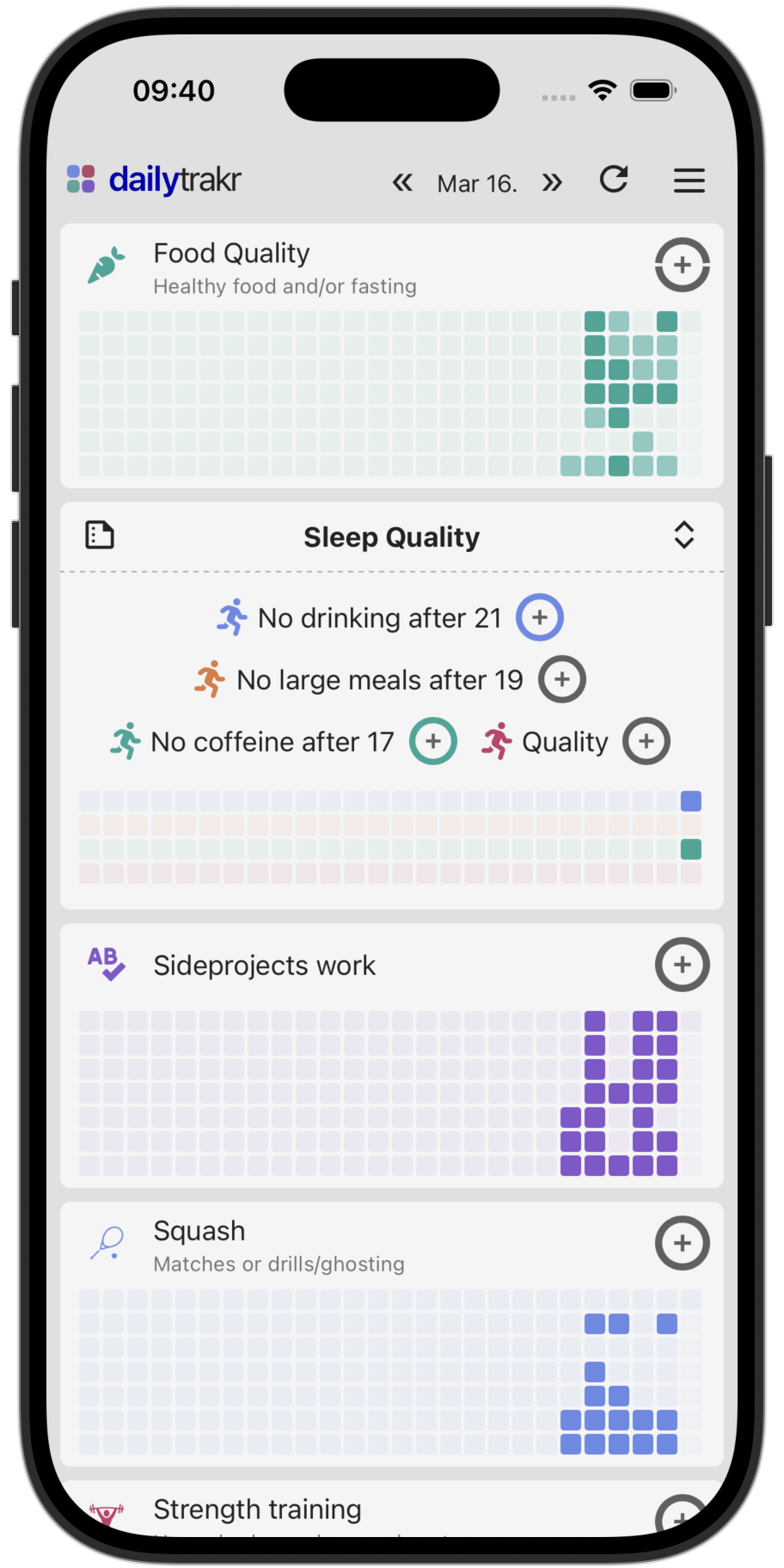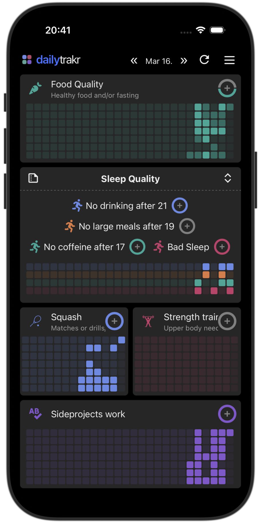 A daily habit tracker that focus on consistency over quantity. Supports advanced layouts and setting up habits in "cause-effect" groups as well (for traking habits leading to good sleep and similar).