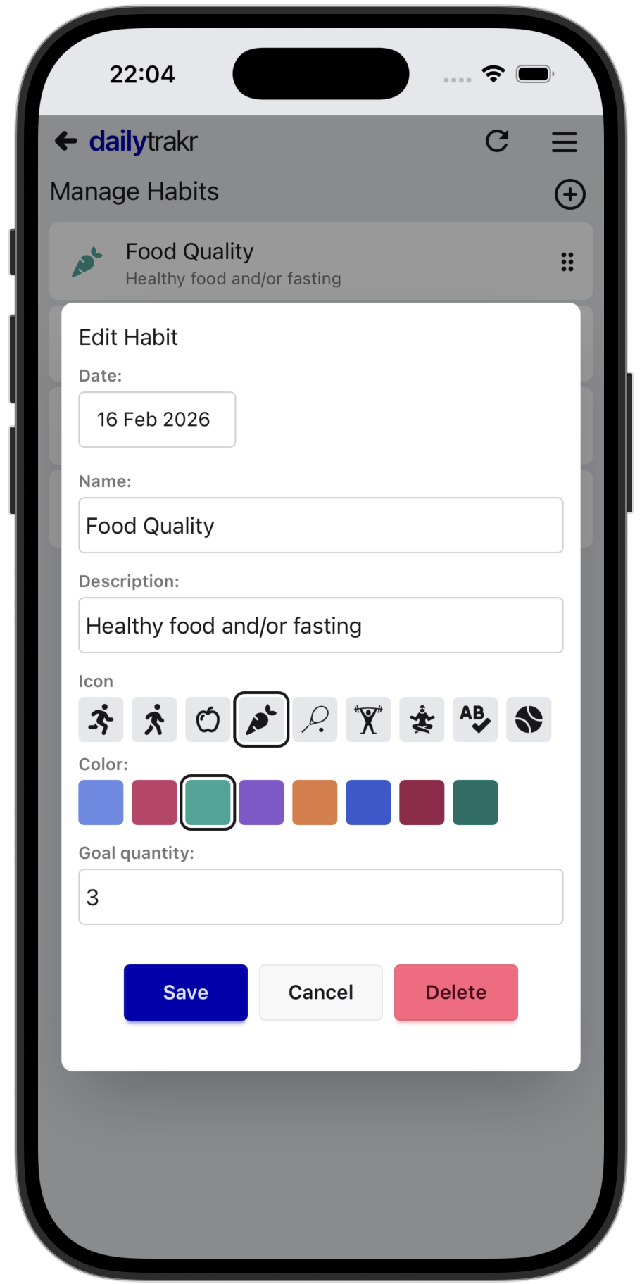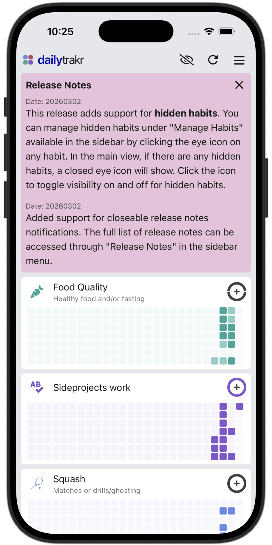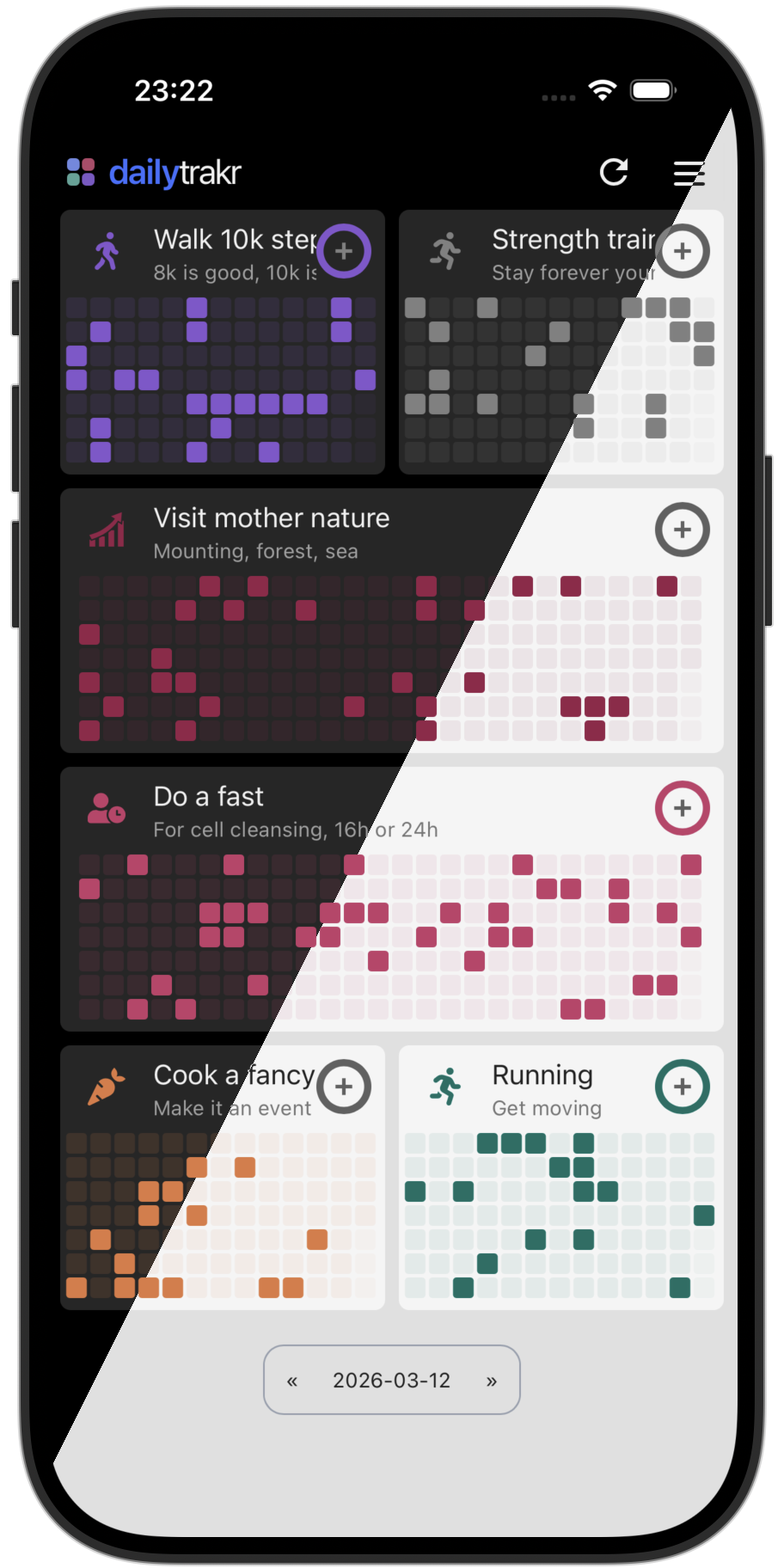 A daily habit tracker that focus on consistency over quantity. Supports advanced layouts and setting up habits in "cause-effect" groups as well (for traking habits leading to good sleep and similar).