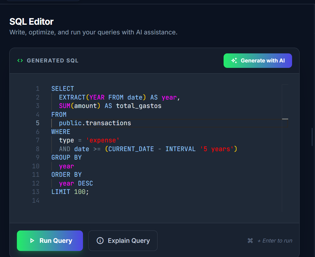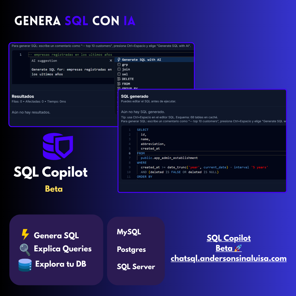 Genera consultas SQL con IA y explora tu base de datos más rápido.