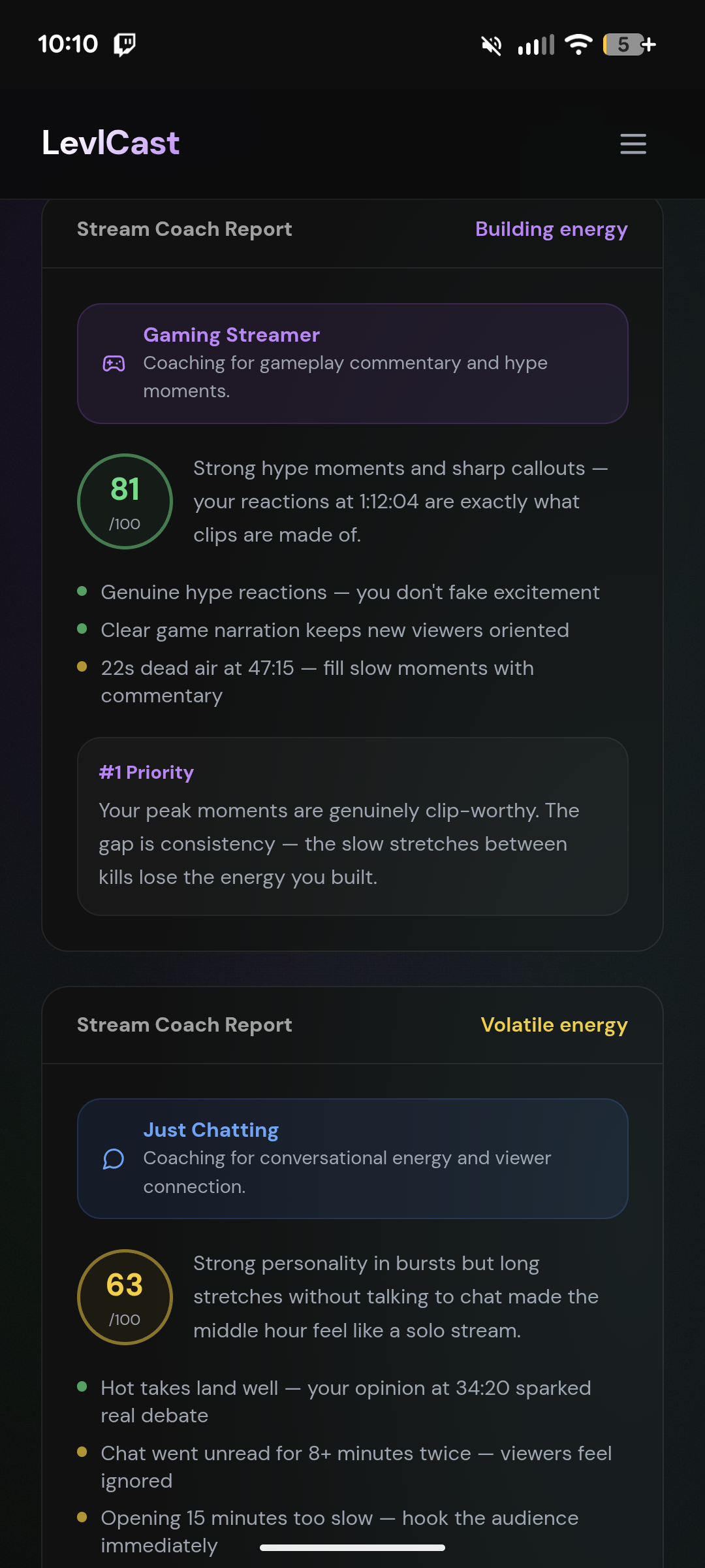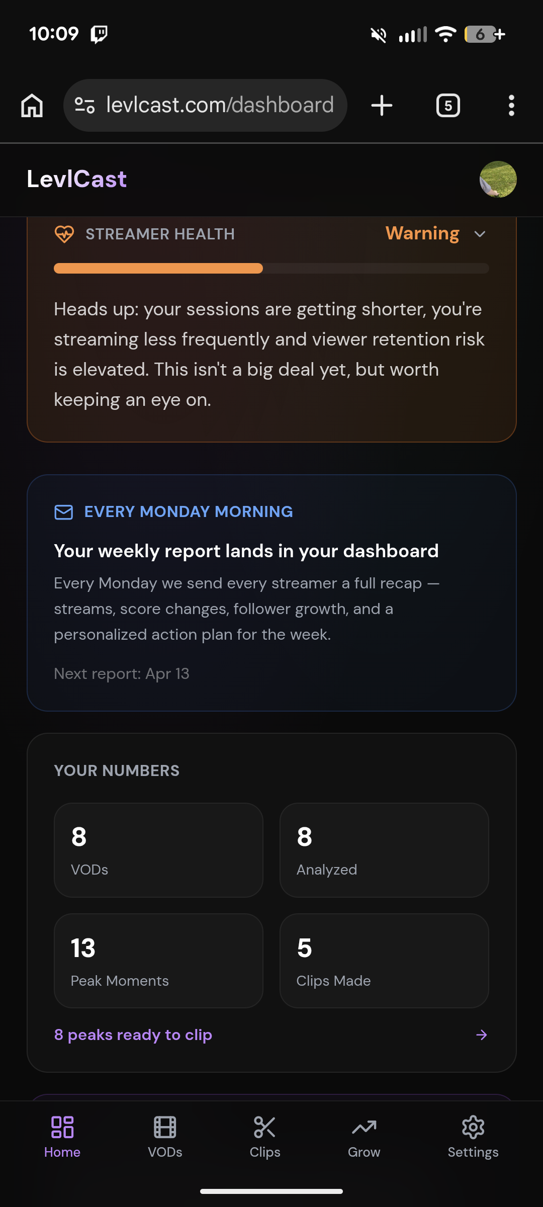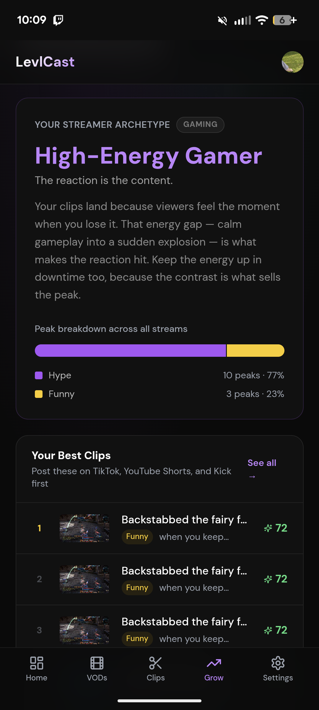 LevlCast is your personal manager for Twitch streamers who don't have a team of employees. It has tons of features including VOD reports, weekly reports, stream title optimization, auto creates clips and posts them to your socials. Tons more!