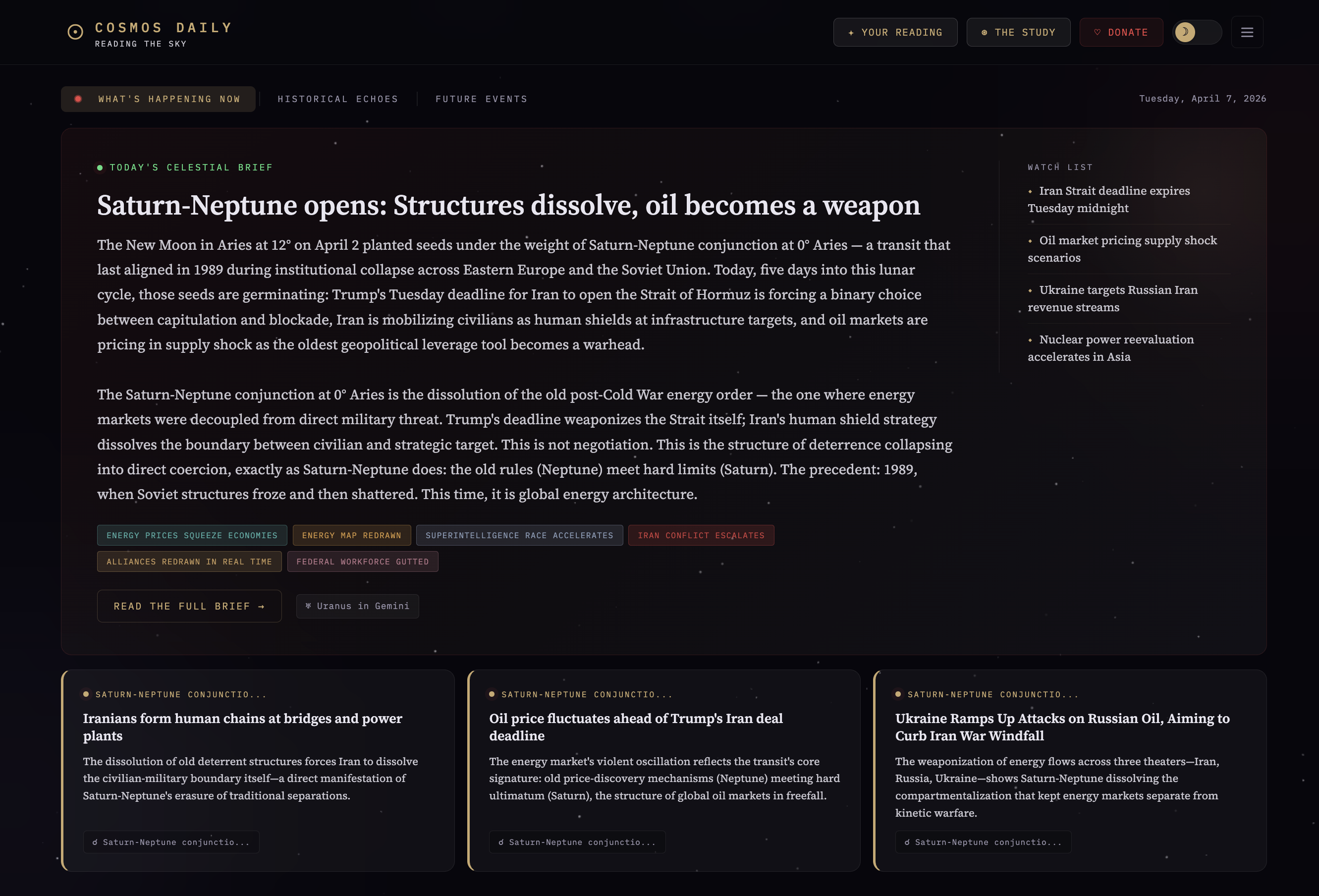 Cosmos Daily is a data-driven archive and news platform that explores the correlation between celestial mechanics and geopolitical shifts. We’ve indexed nearly 200 major historical events against NASA ephemeris data to identify 'historical echoes.' In an era of unprecedented global volatility, we provide a unique lens for anticipating institutional shifts, helping readers understand the structural cycles of power, technology, and revolution before they hit the front page.