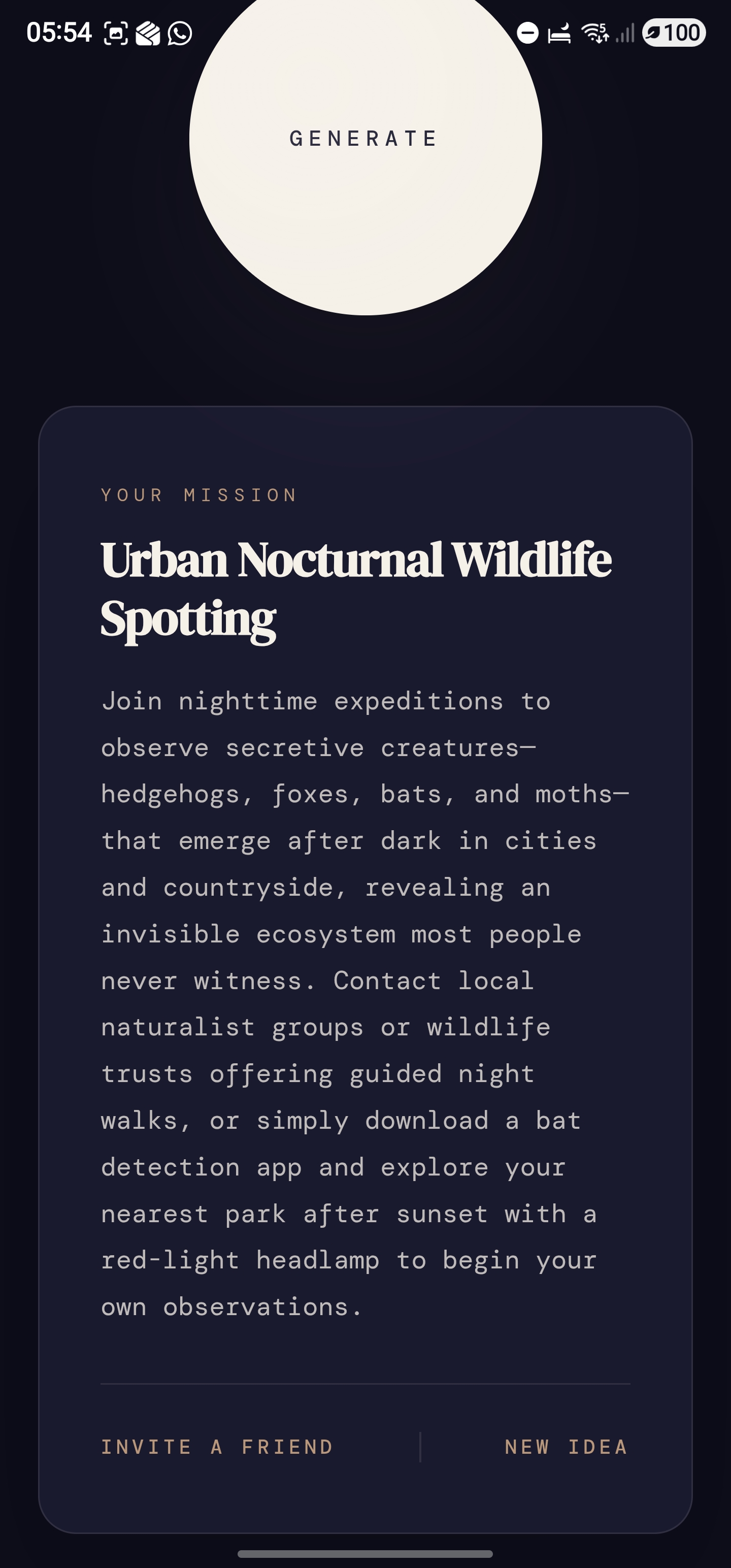 Hobbyist AI generates unique, unusual activity suggestions powered by artificial intelligence — helping you discover niche hobbies and experiences you'd never think to try yourself. Not bowling. Not the pub. Something genuinely different. Every time you press Generate, the AI suggests a real activity — something niche, social, or adventurous — with a brief explanation of what it is and exactly how to get started today. • Completely free to use • No account or sign up required • Day and night suggestions • Share ideas with friends instantly • New suggestion every time Whether you're bored on a Sunday afternoon or looking for your next obsession, Hobbyist AI will point you somewhere unexpected. Tap Generate. See what happens.