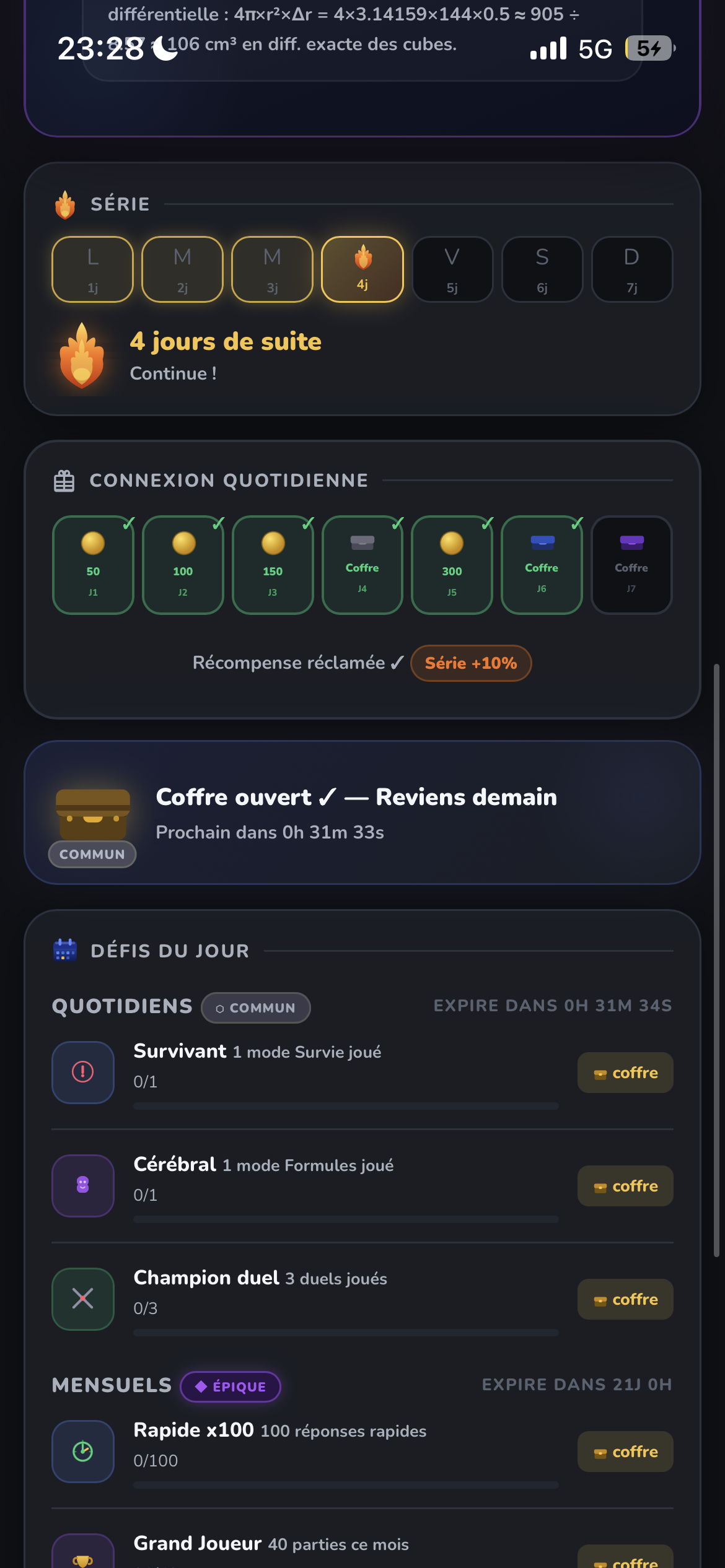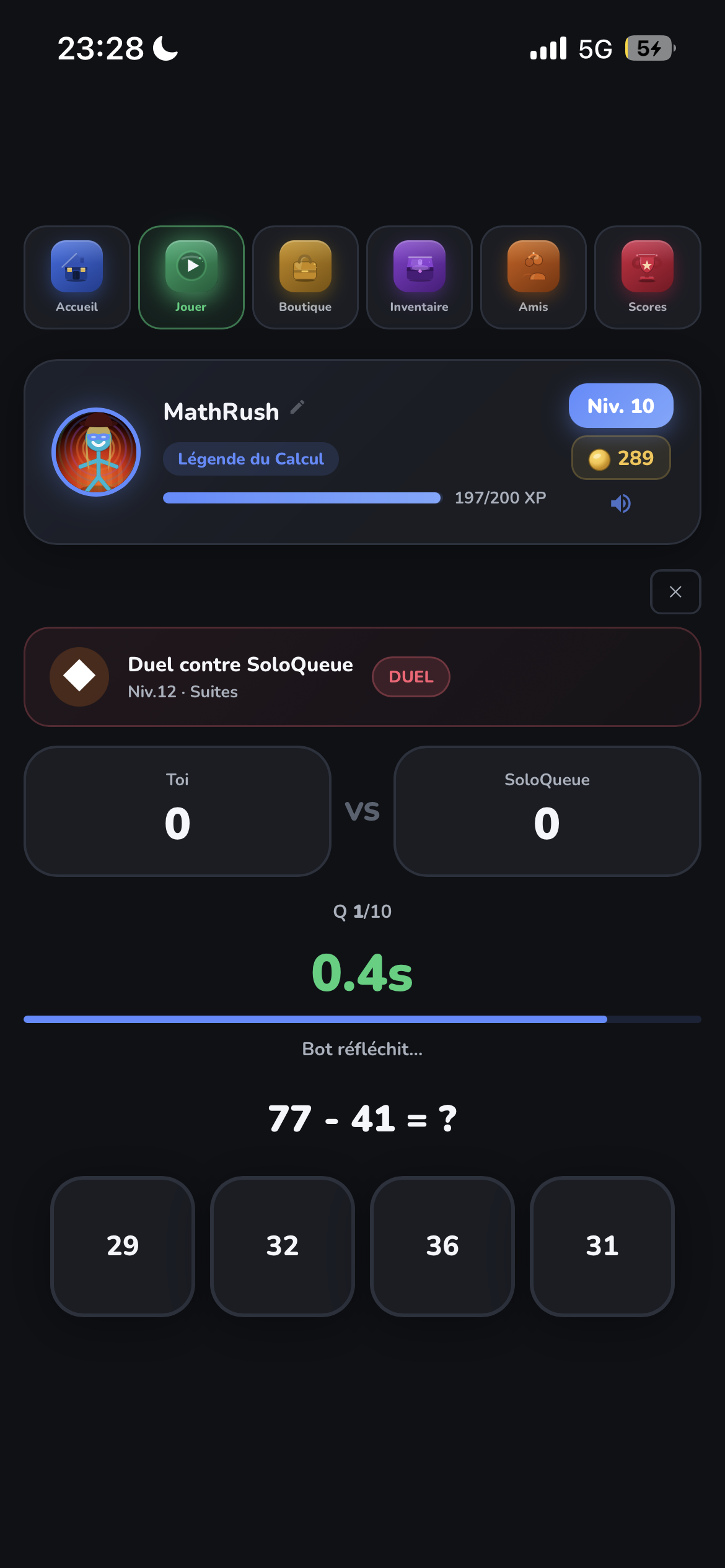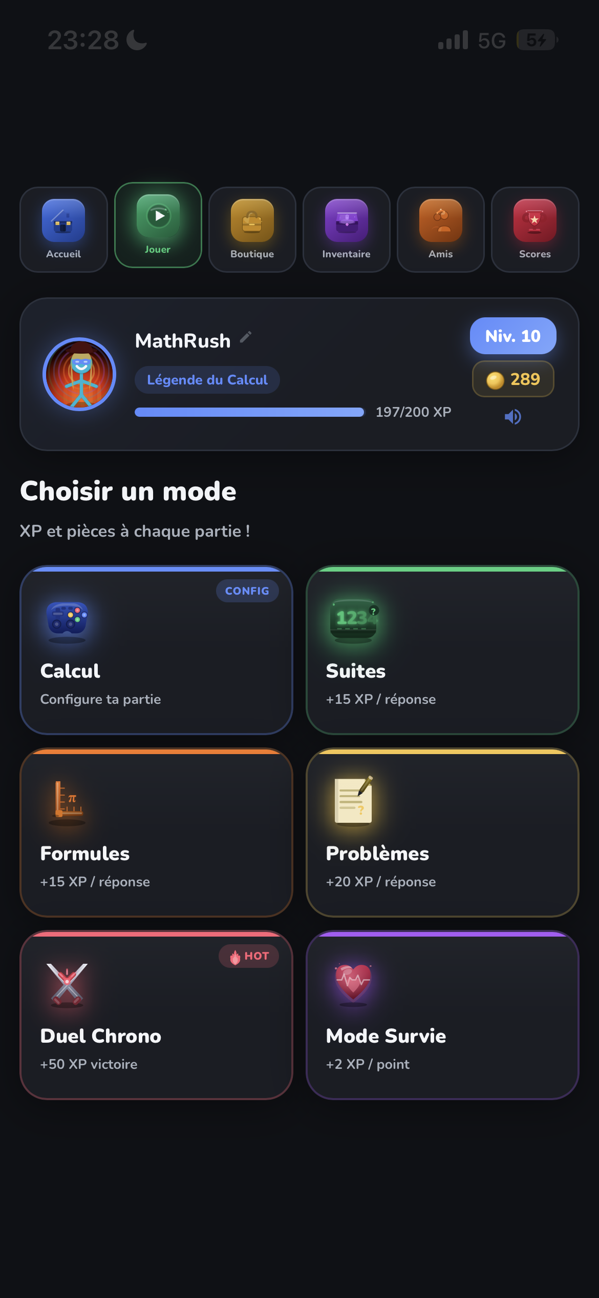 MathRush is a fast-paced mobile game that turns math into an addictive and competitive experience. Designed for short sessions, it challenges players through multiple game modes like calculations, sequences, problems, and high-risk prediction mechanics such as “higher or lower.” Each game lasts between 30 seconds and 2 minutes, making it perfect for quick play while still rewarding skill and progression. Players earn coins and XP, unlock chests with different rarities (common to legendary), and collect unique items to personalize their profile. With streak systems, daily and monthly challenges, and competitive leaderboards, MathRush keeps players engaged while subtly improving their mental math and decision-making skills. Simple to understand but hard to master, MathRush blends logic, speed, and risk-taking into a highly replayable experience built for both casual players and competitive minds.