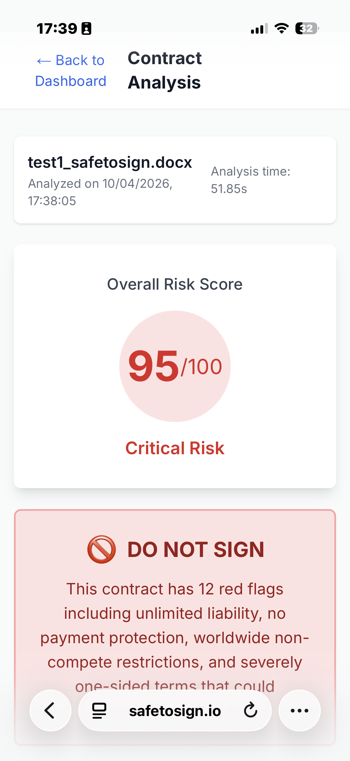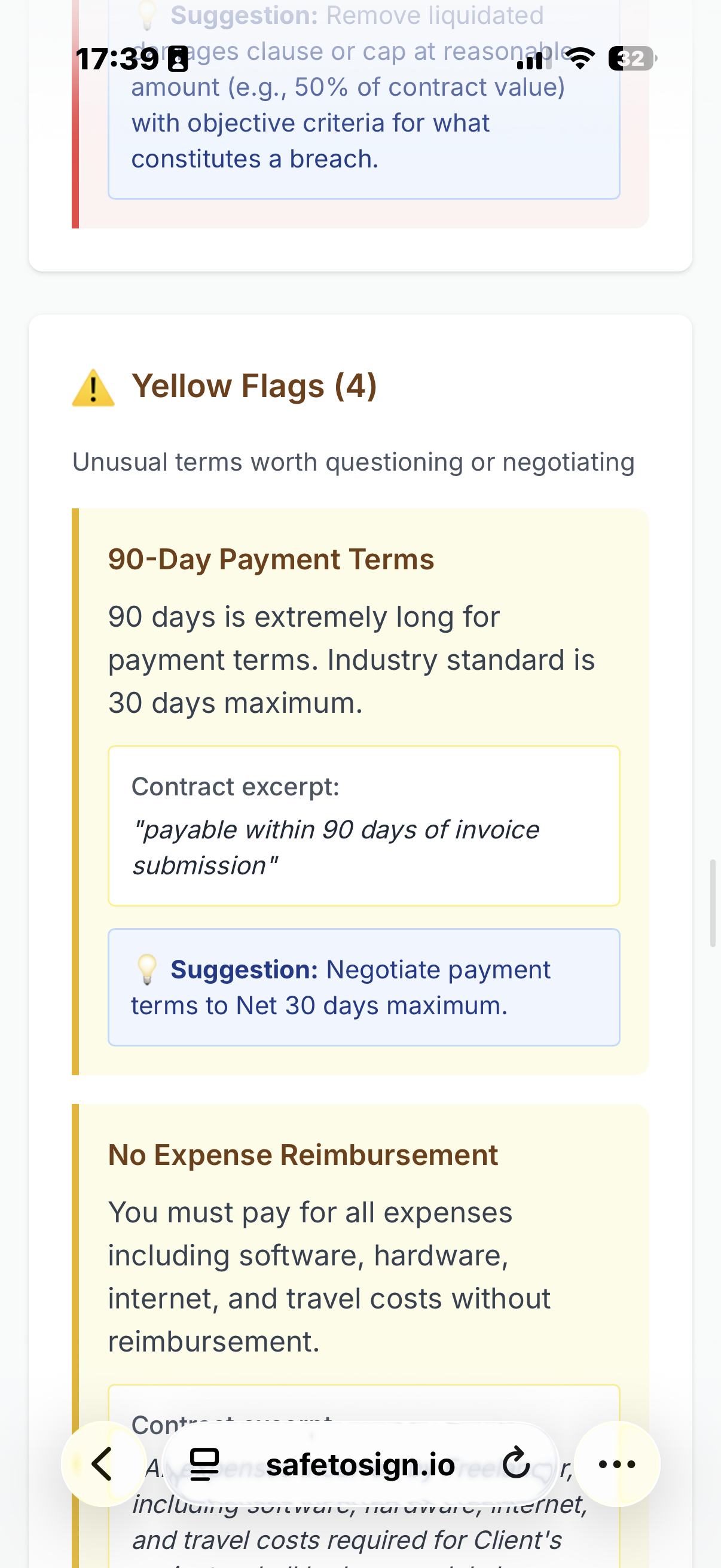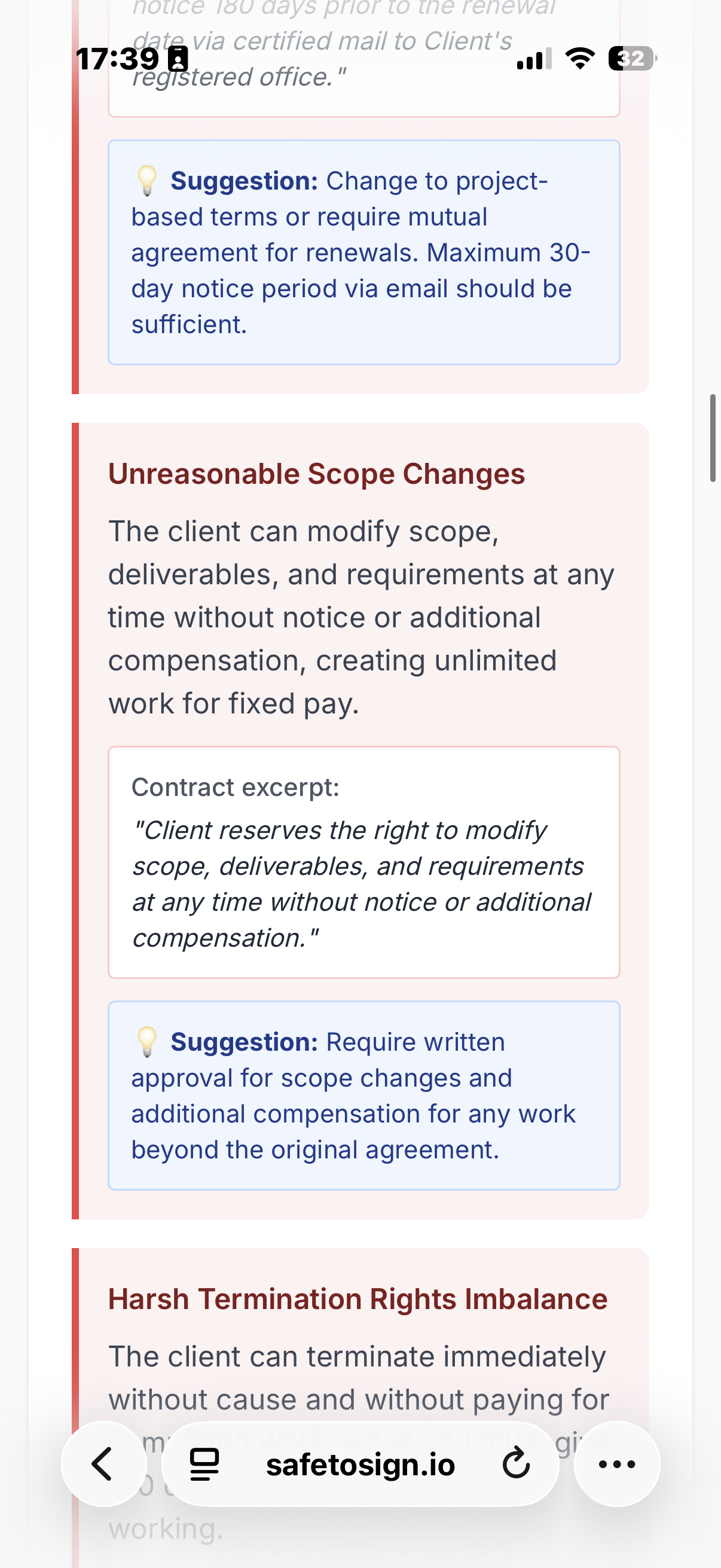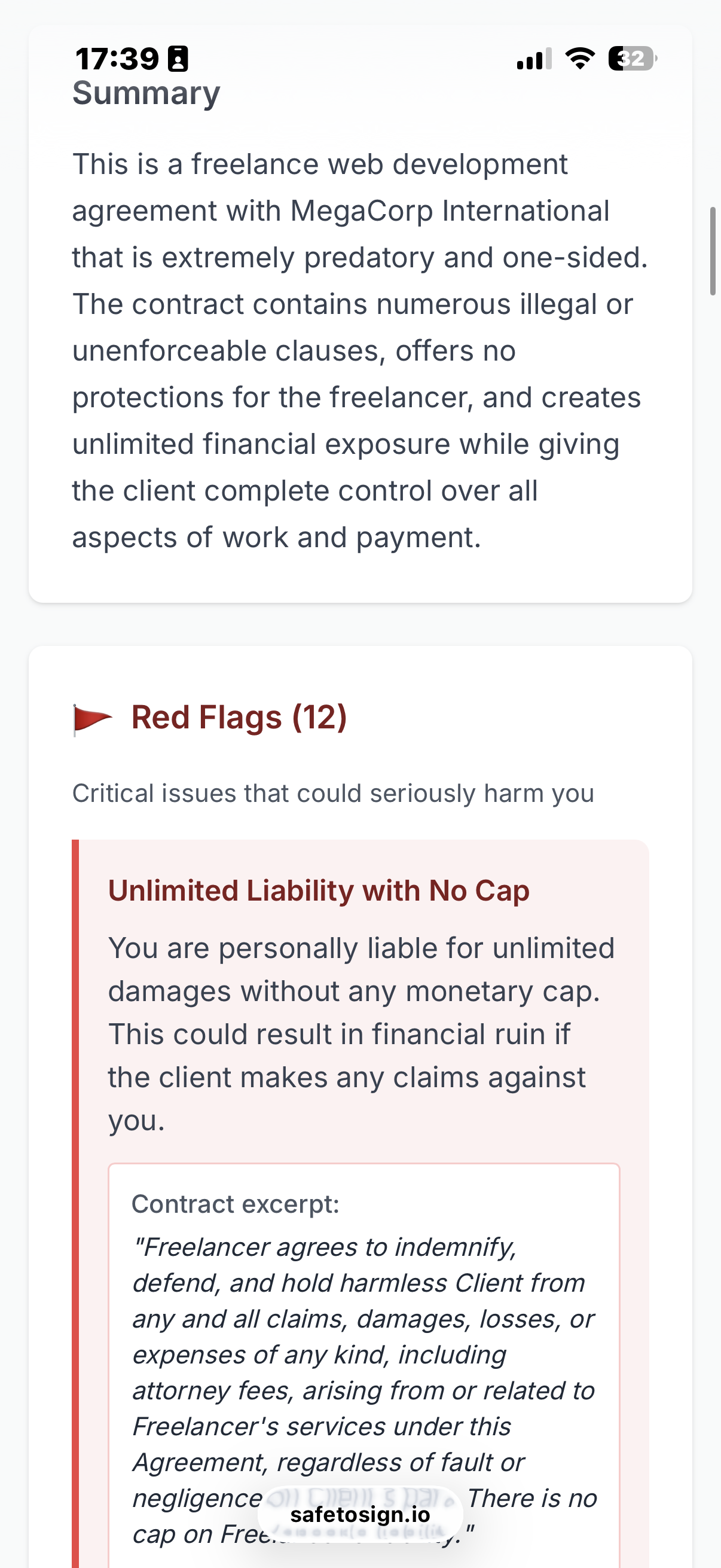 SafetoSign is a must-have for freelancers who are tired of 'hoping for the best' when signing contracts. It acts like a digital legal expert, scanning your agreements for dangerous red flags like 'IP grabs' or 'unlimited liability' in seconds. For those of us in the EU/UK who can't spend thousands on legal fees, this tool provides massive peace of mind. It translates complex legalese into plain English so you actually know what you’re signing. It’s the ultimate safety net for your freelance business.