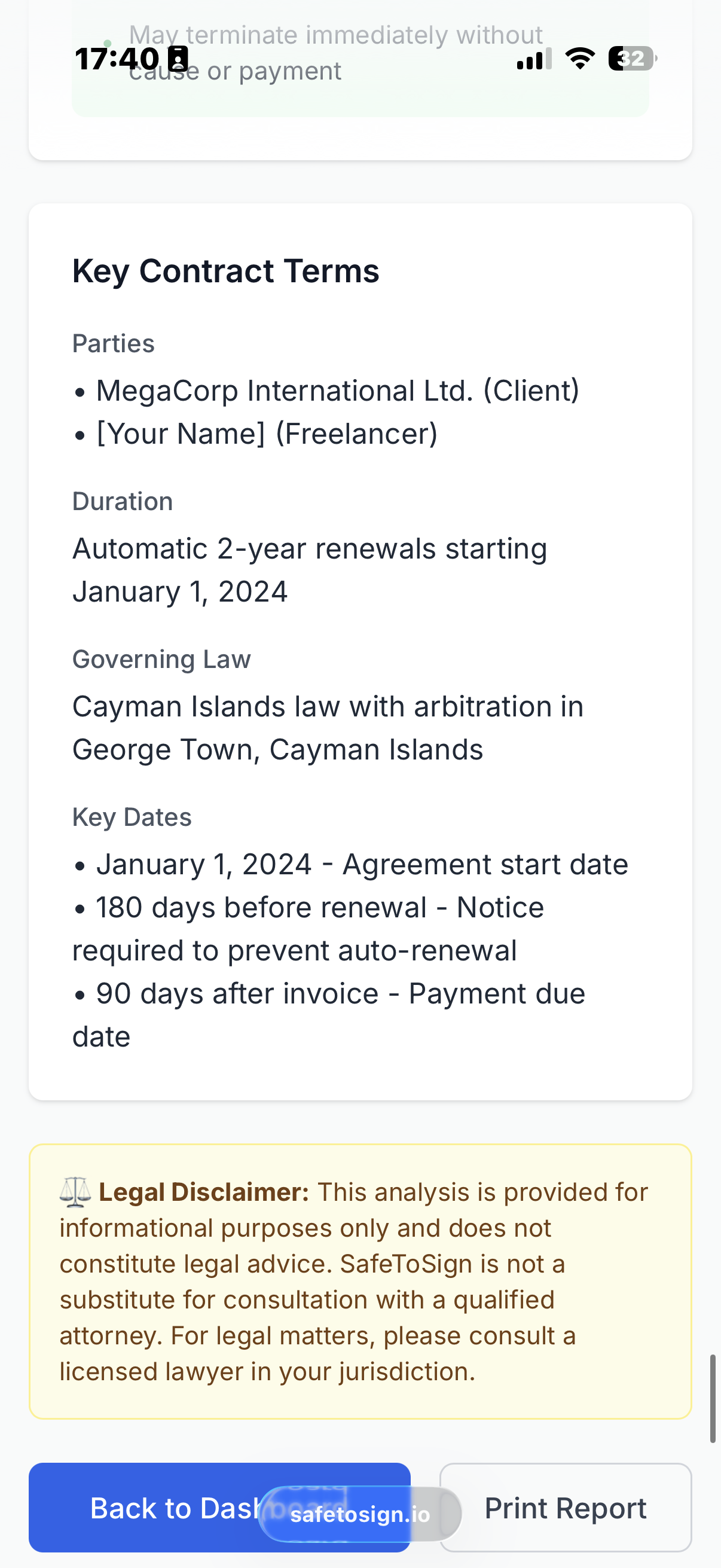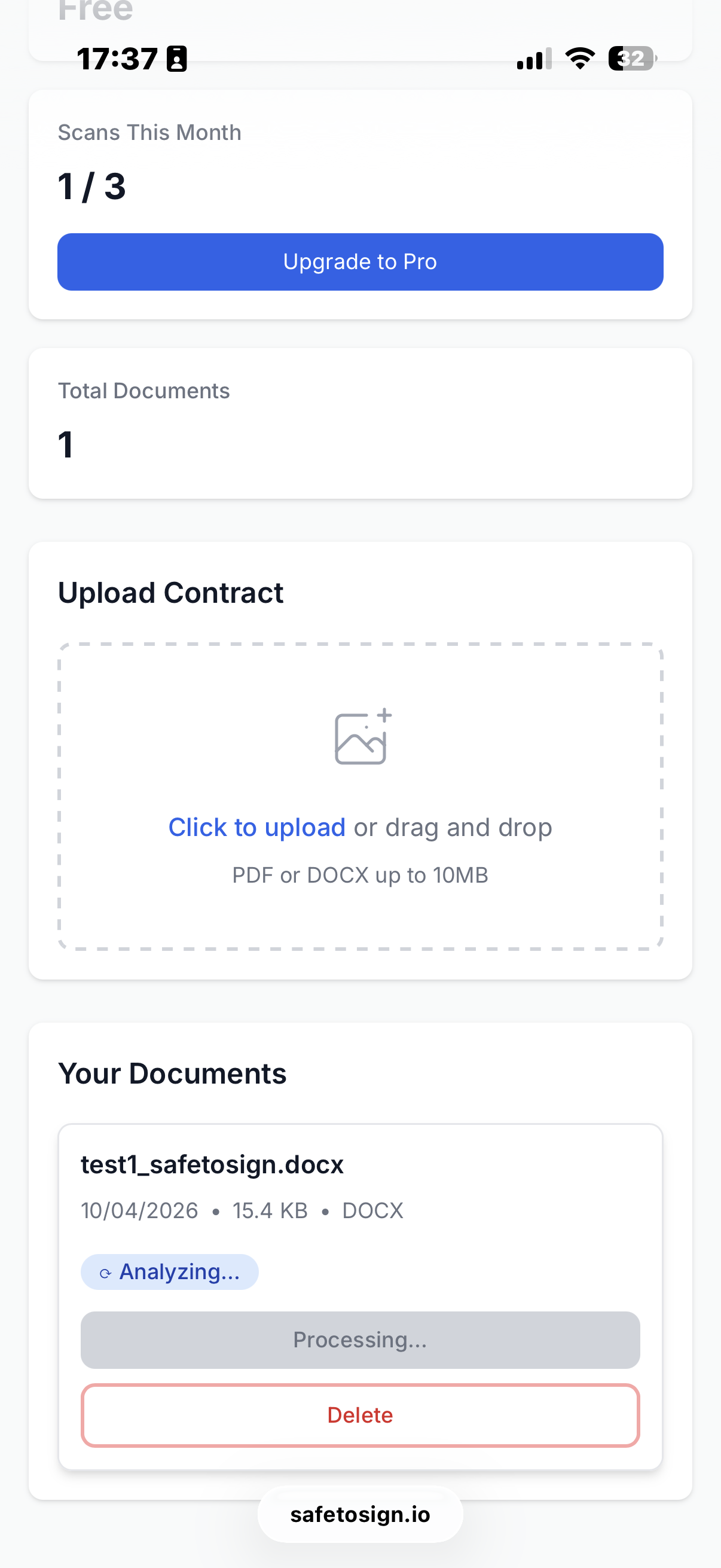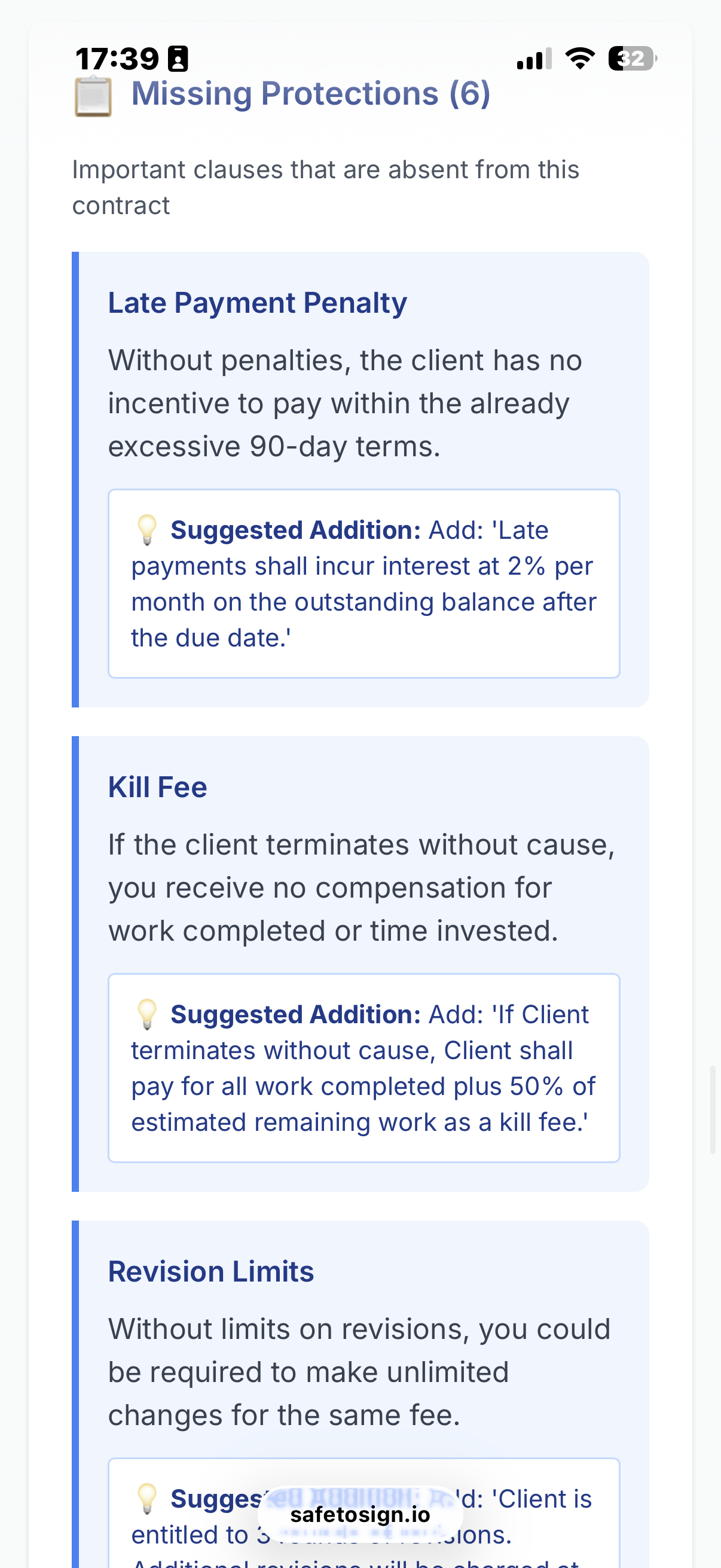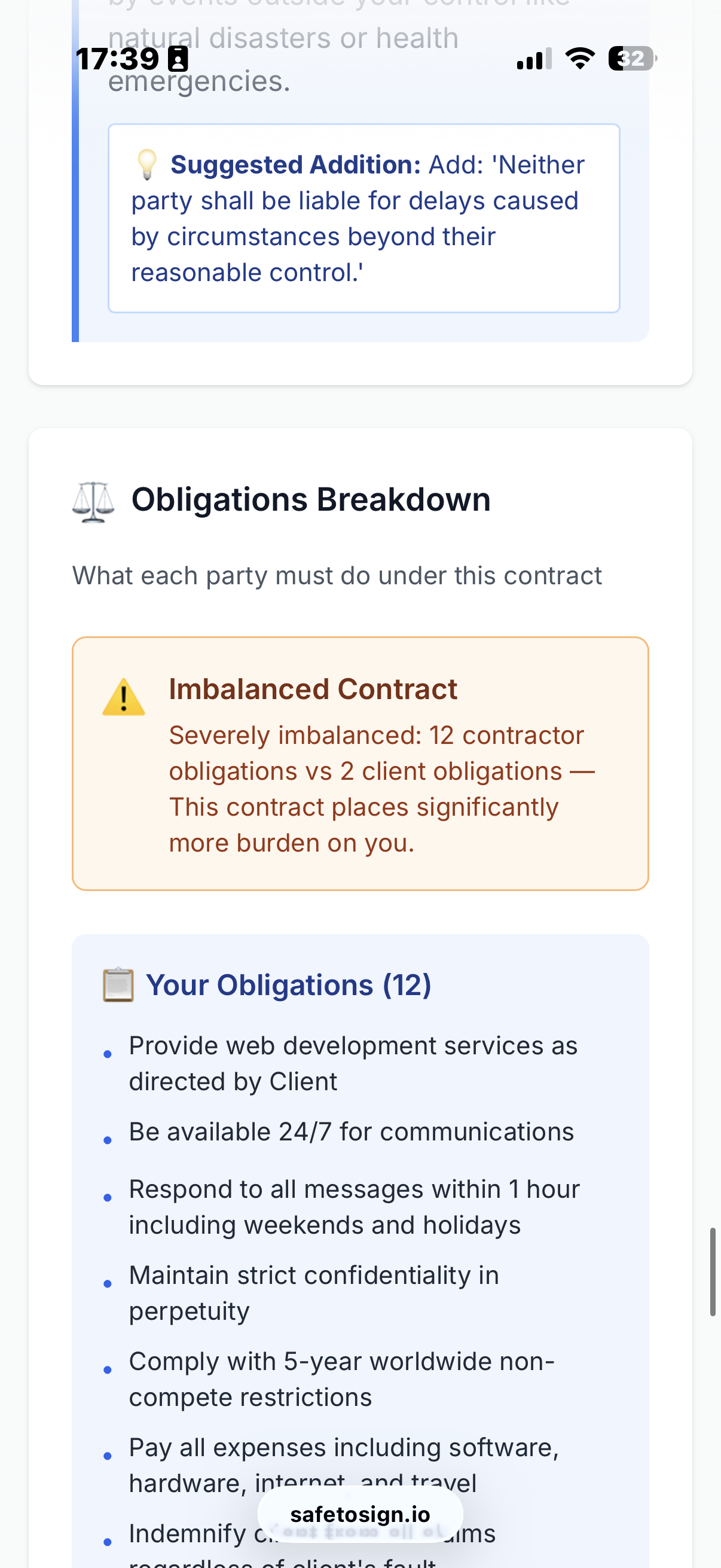 SafetoSign is a must-have for freelancers who are tired of 'hoping for the best' when signing contracts. It acts like a digital legal expert, scanning your agreements for dangerous red flags like 'IP grabs' or 'unlimited liability' in seconds. For those of us in the EU/UK who can't spend thousands on legal fees, this tool provides massive peace of mind. It translates complex legalese into plain English so you actually know what you’re signing. It’s the ultimate safety net for your freelance business.