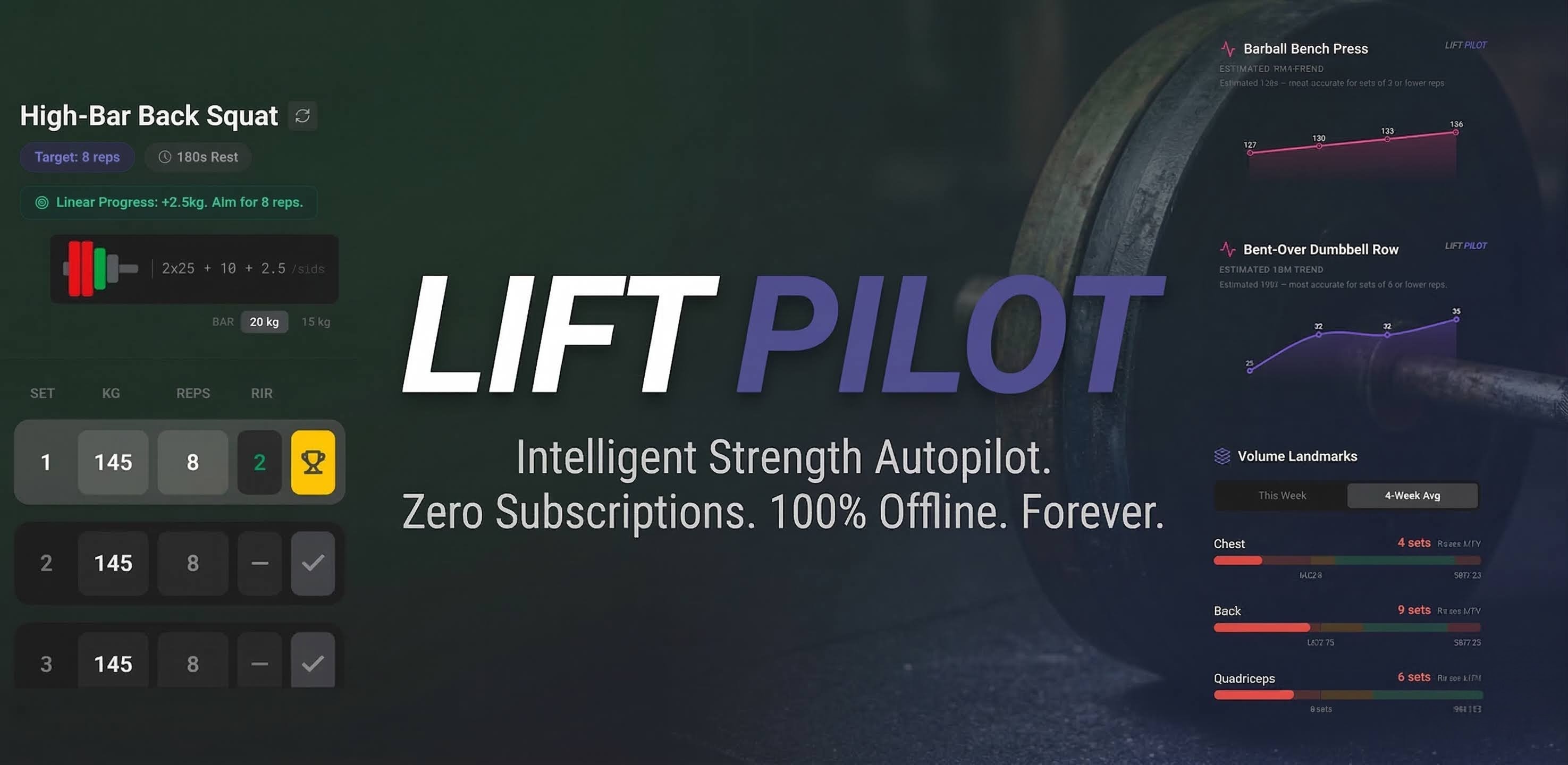 LiftPilot is a gym instrument panel designed for lifters who are tired of gym apps that look like corporate wellness portals. It replaces the gym log with a deterministic Autopilot Engine that plans every exercise, weight, rep and ensures you meet volume and progressive overload targets, tracks your Reps in Reserve (RIR) against your recovery landmarks (MRV) in real-time. It uses a 28-day fatigue window to tell you exactly when to push for a PR and when your body is screaming for a deload. Why should you care? Because it’s 100% offline-first, harvests zero data, and has zero subscriptions. It’s a professional-grade tool you buy once and own forever built by a lifter for lifters who want science, not social media.