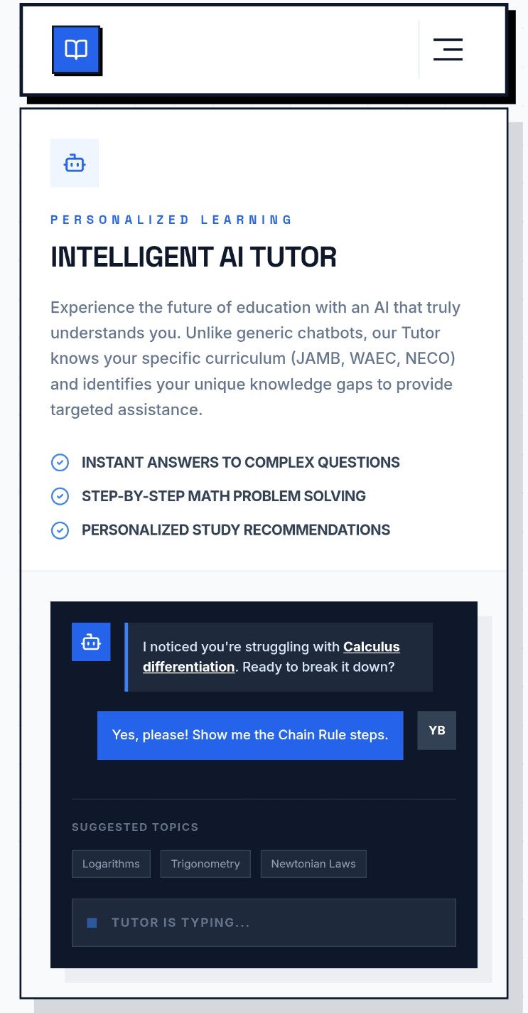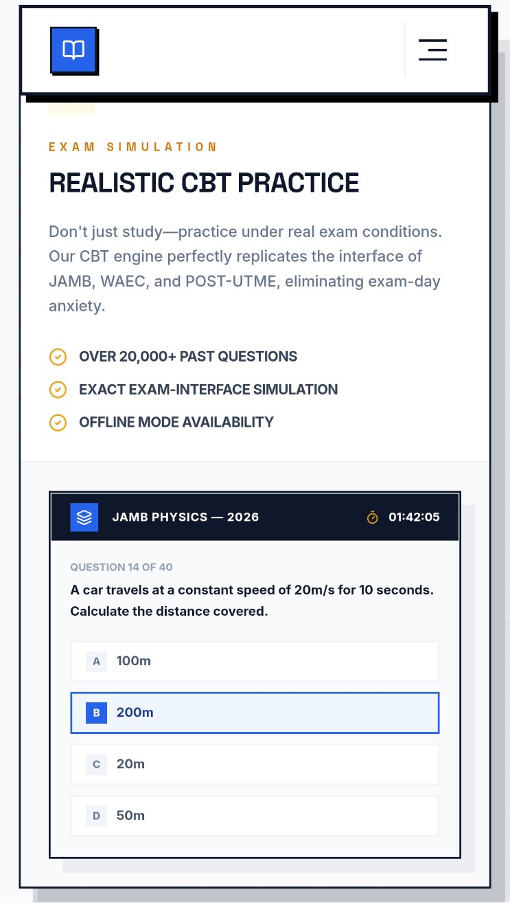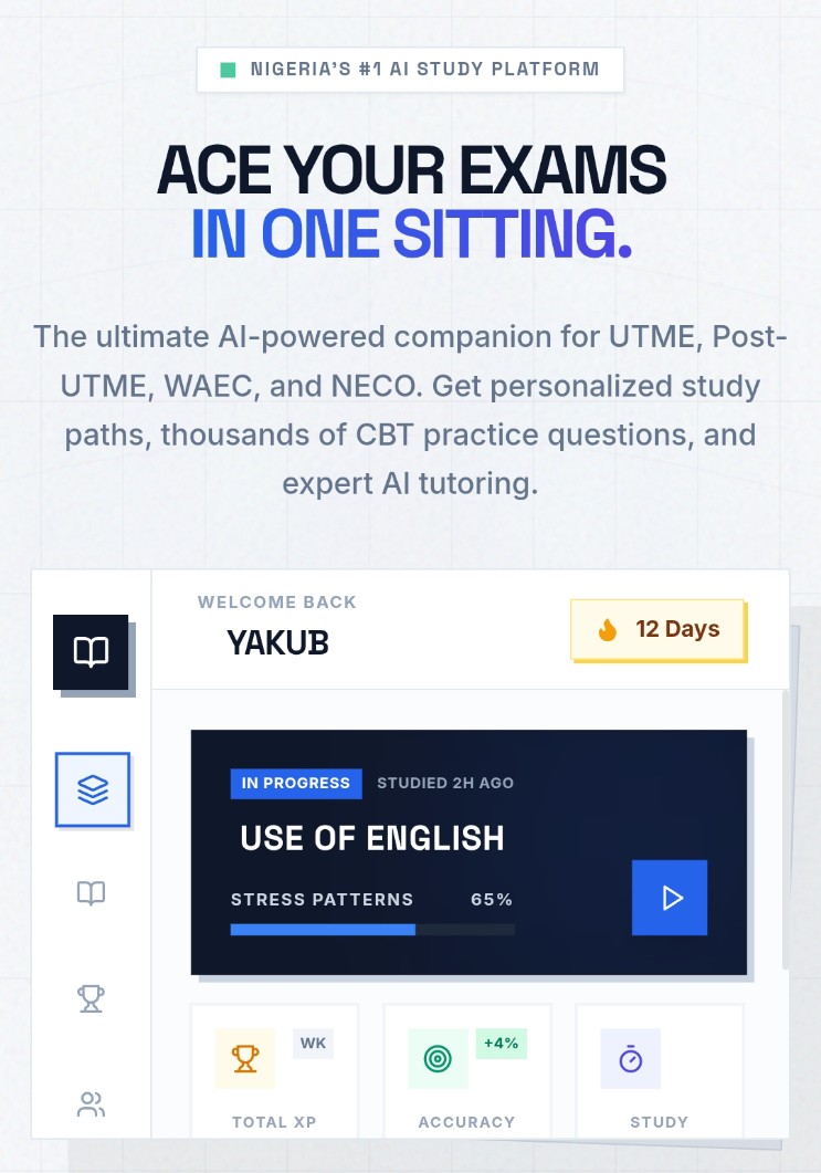 The ultimate AI-powered companion for UTME, Post-UTME, WAEC, and NECO. Get personalized study paths, thousands of CBT practice questions, and expert AI tutoring.