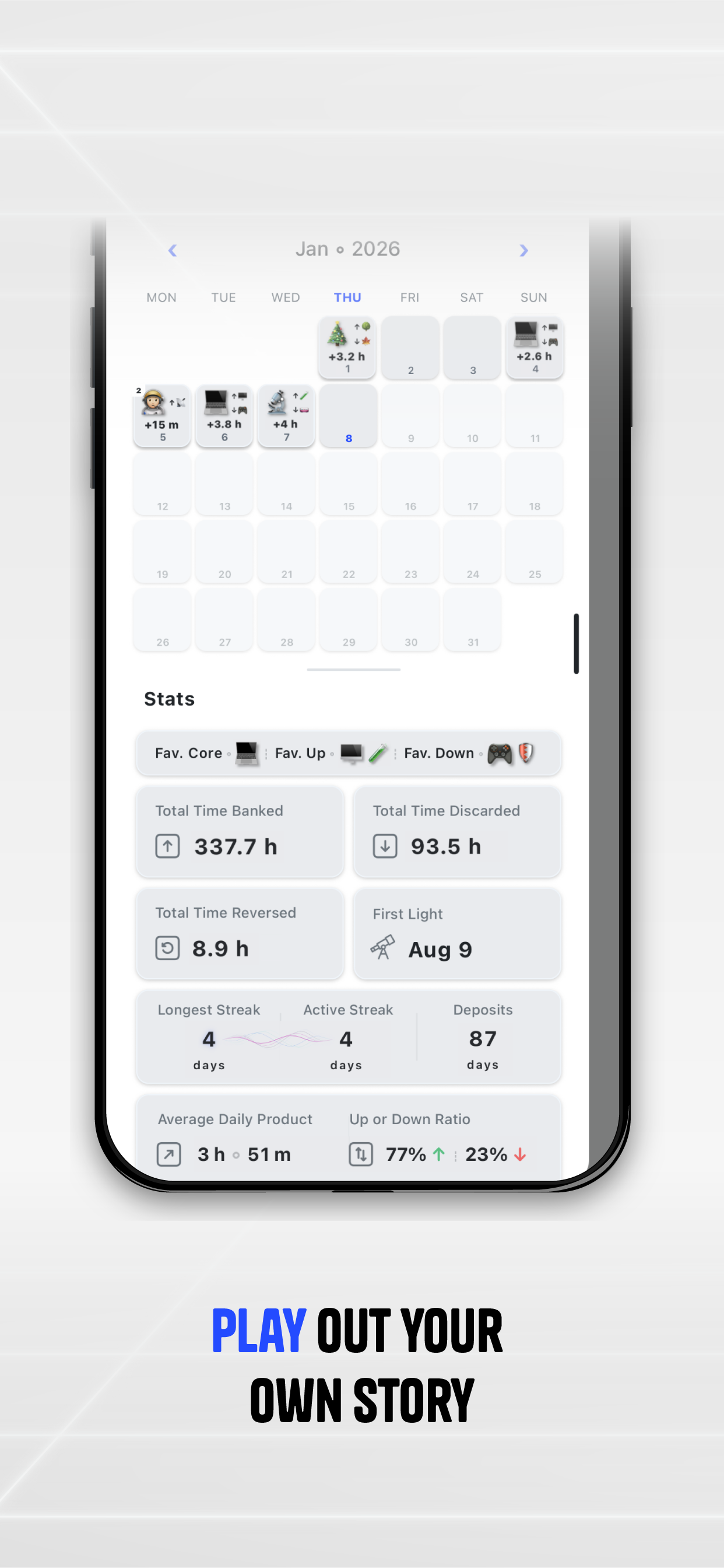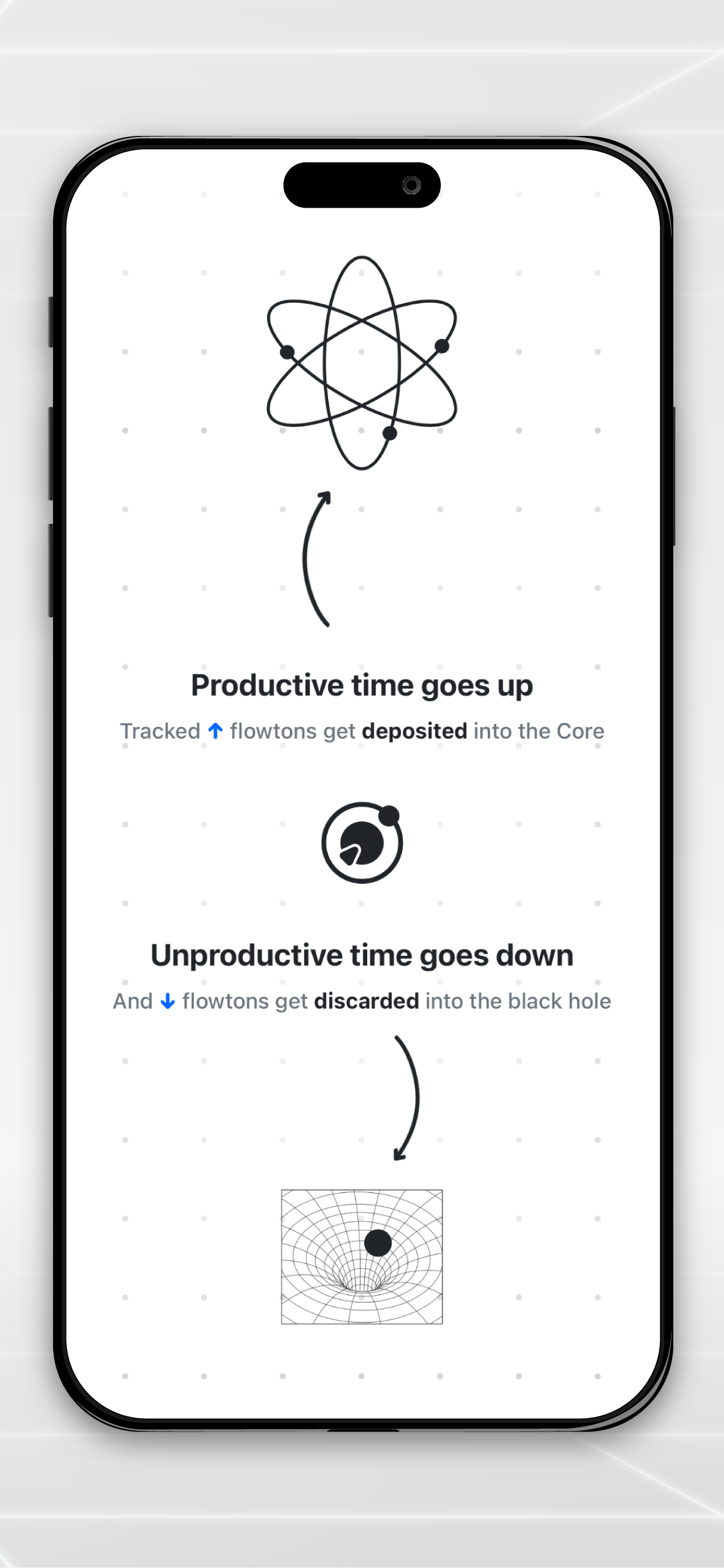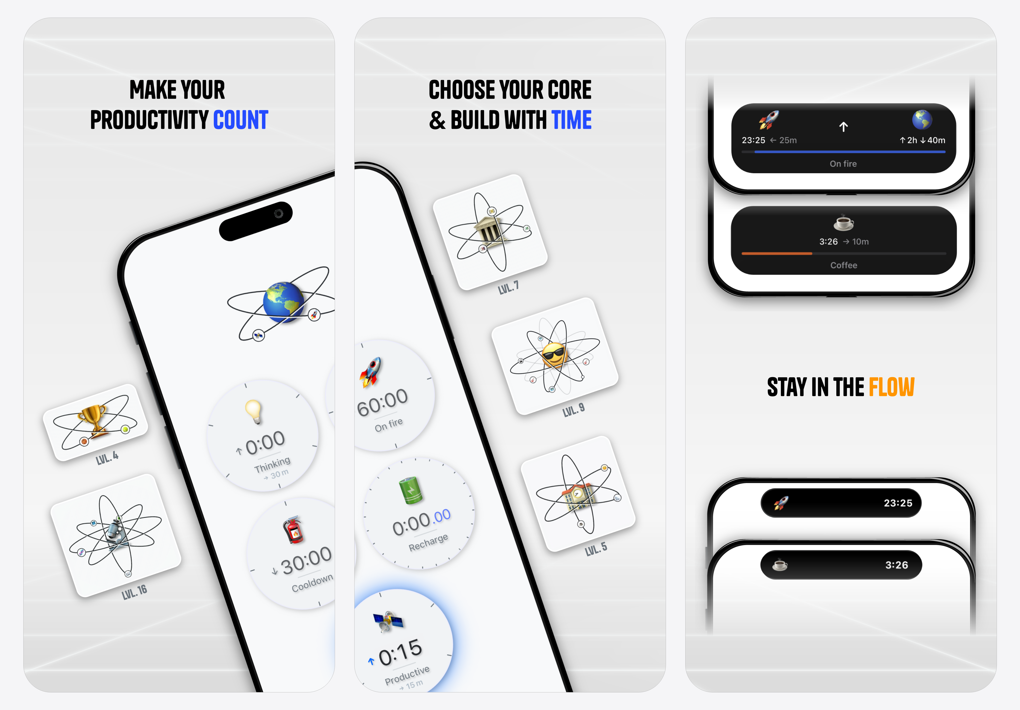 Novel Sci-Fi Productivity Game app that tracks productive ↑ up time vs unproductive ↓ time, using time particles. Includes full Dynamic Island support.