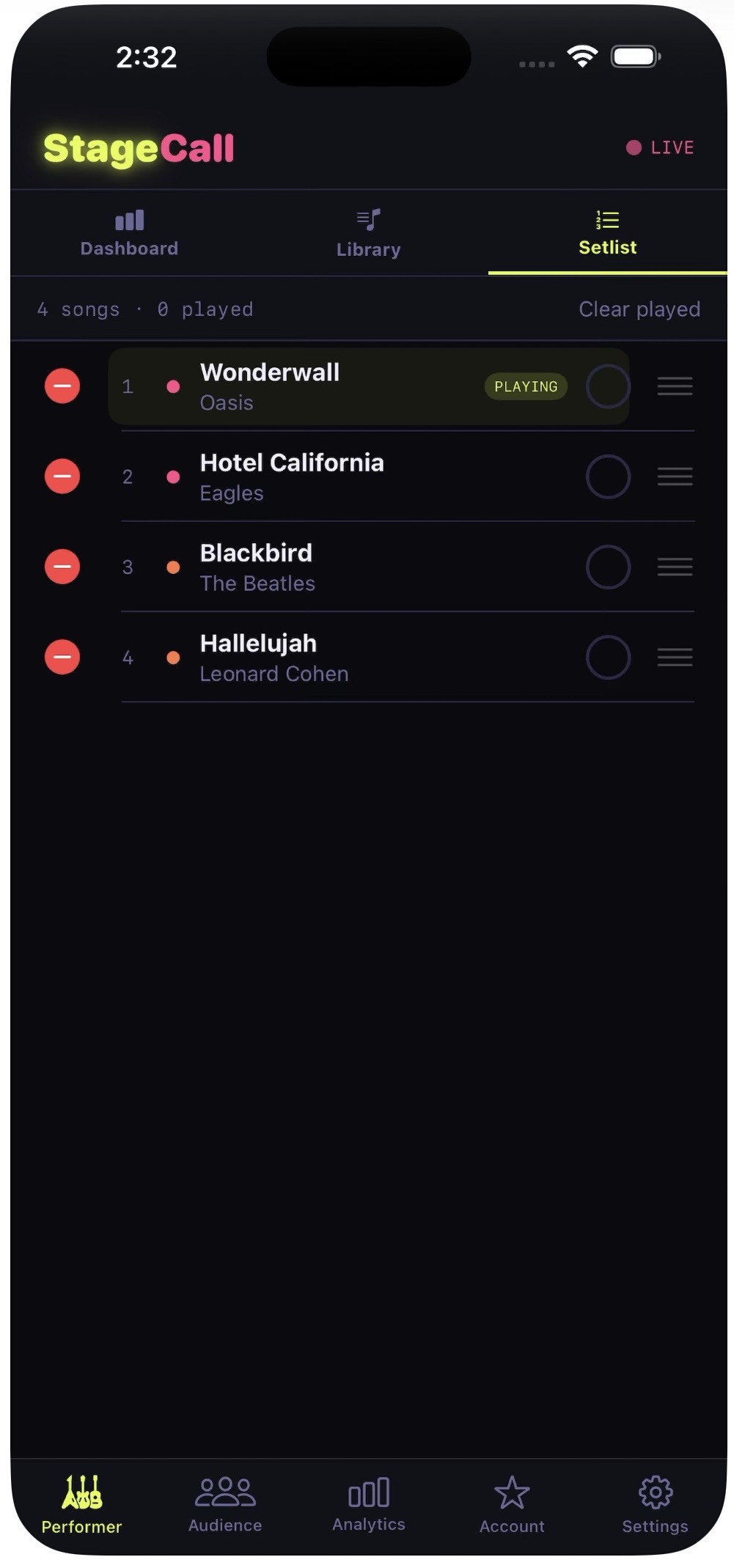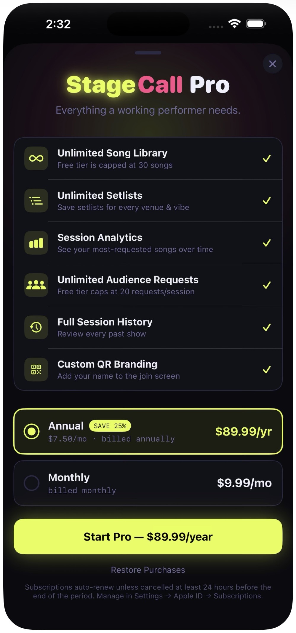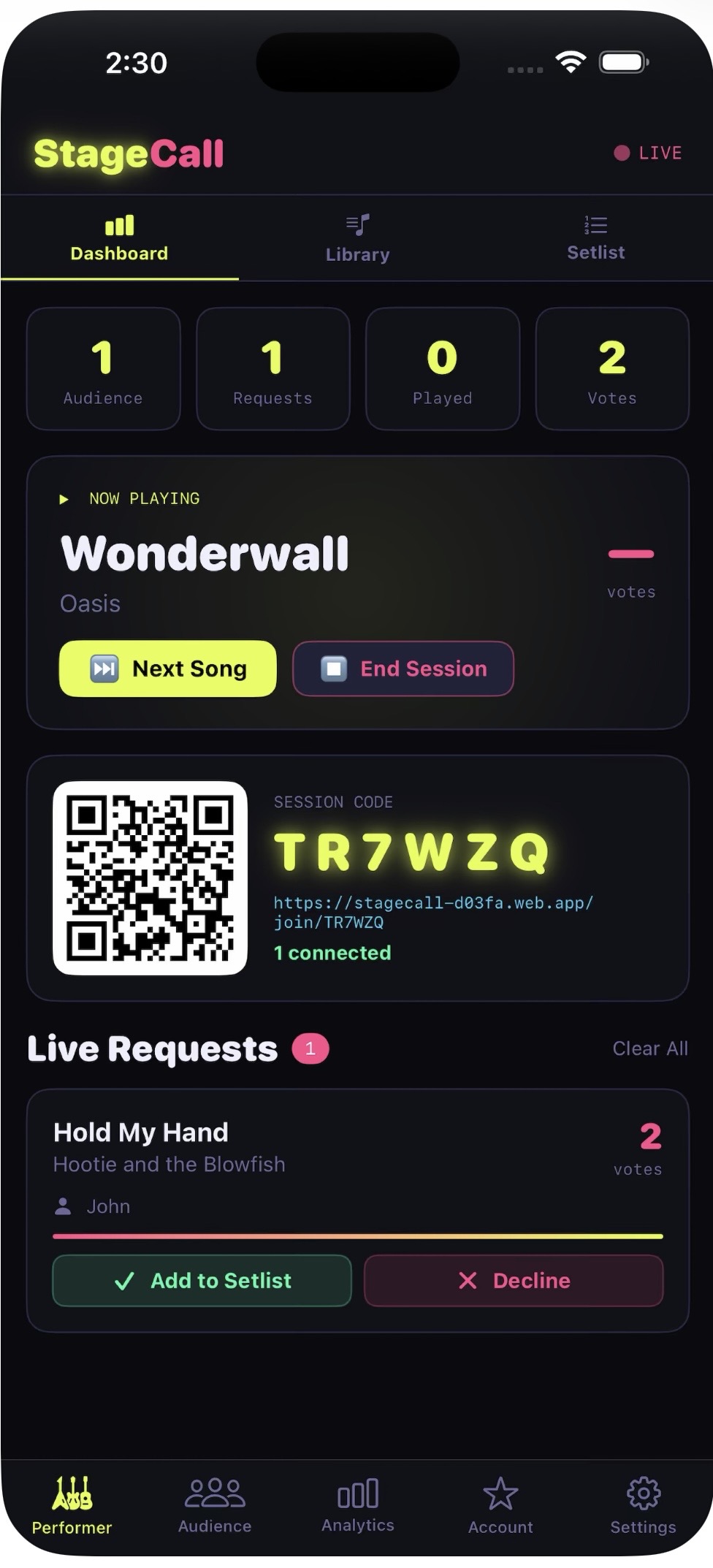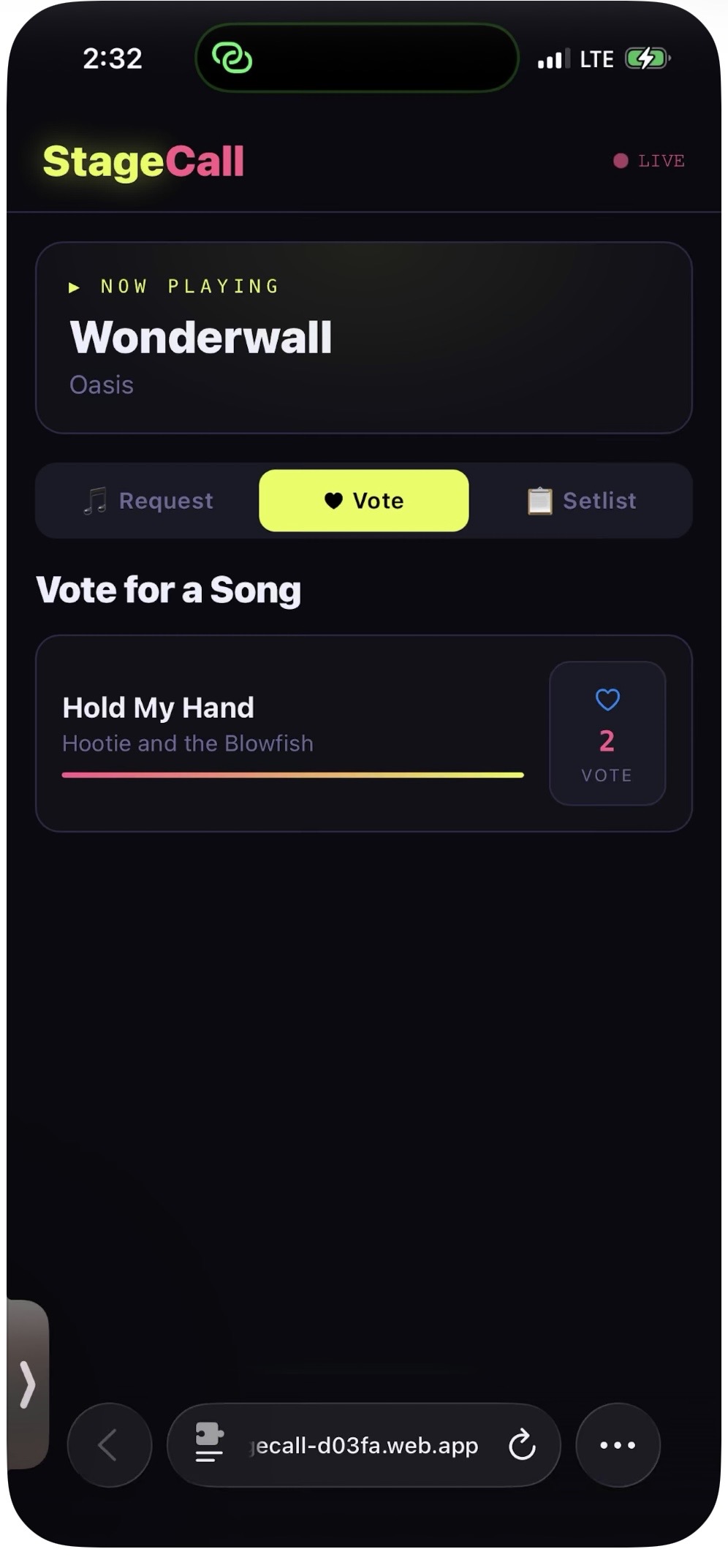 StageCall was built by a working musician who got tired of the chaos that comes with taking live requests. Paper slips get lost. People shout while you're mid-song. You can't hear them. You forget who asked for what. It's a mess. StageCall fixes all of it. Your audience scans a QR code from their phone ā no app download needed ā and requests songs directly. Requests come in ranked by crowd votes so you always know what the room wants most. Accept or decline from your phone while you keep playing. FEATURES šø Live song requests via QR code š³ļø Crowd voting ā most popular requests rise to the top šø Built-in tipping via PayPal, Venmo, and Apple Pay šŗ Stage display mode for any TV or screen at the venue š Session analytics ā see your most requested songs šµ Repertoire mode ā audience only requests songs you know WHO IT'S FOR Solo performers, singer-songwriters, acoustic guitarists, open mic performers, wedding musicians, bar performers, and anyone who plays live and takes requests. Free to download. Pro plan from $9.99/month. Available on the App Store ā search StageCall.