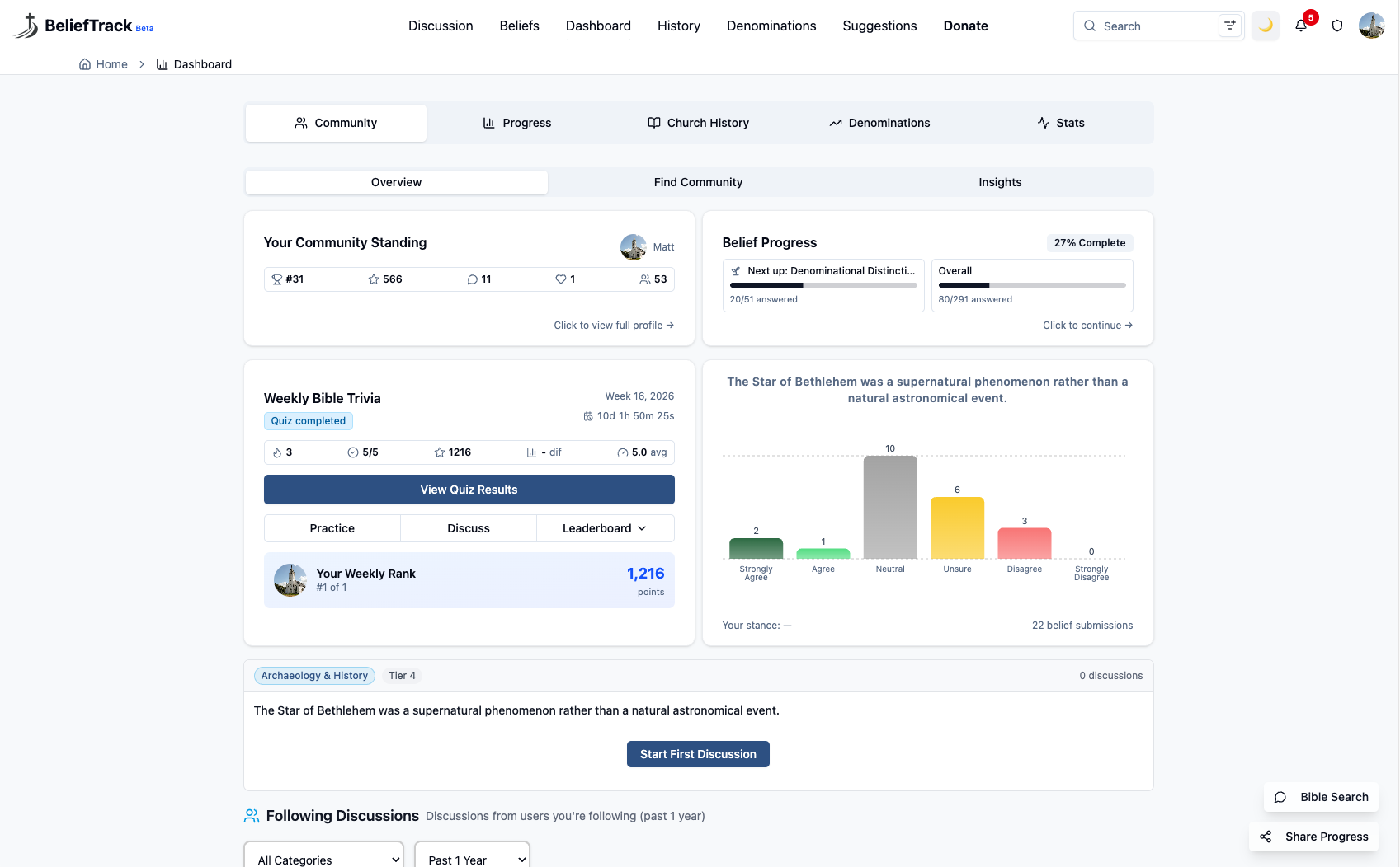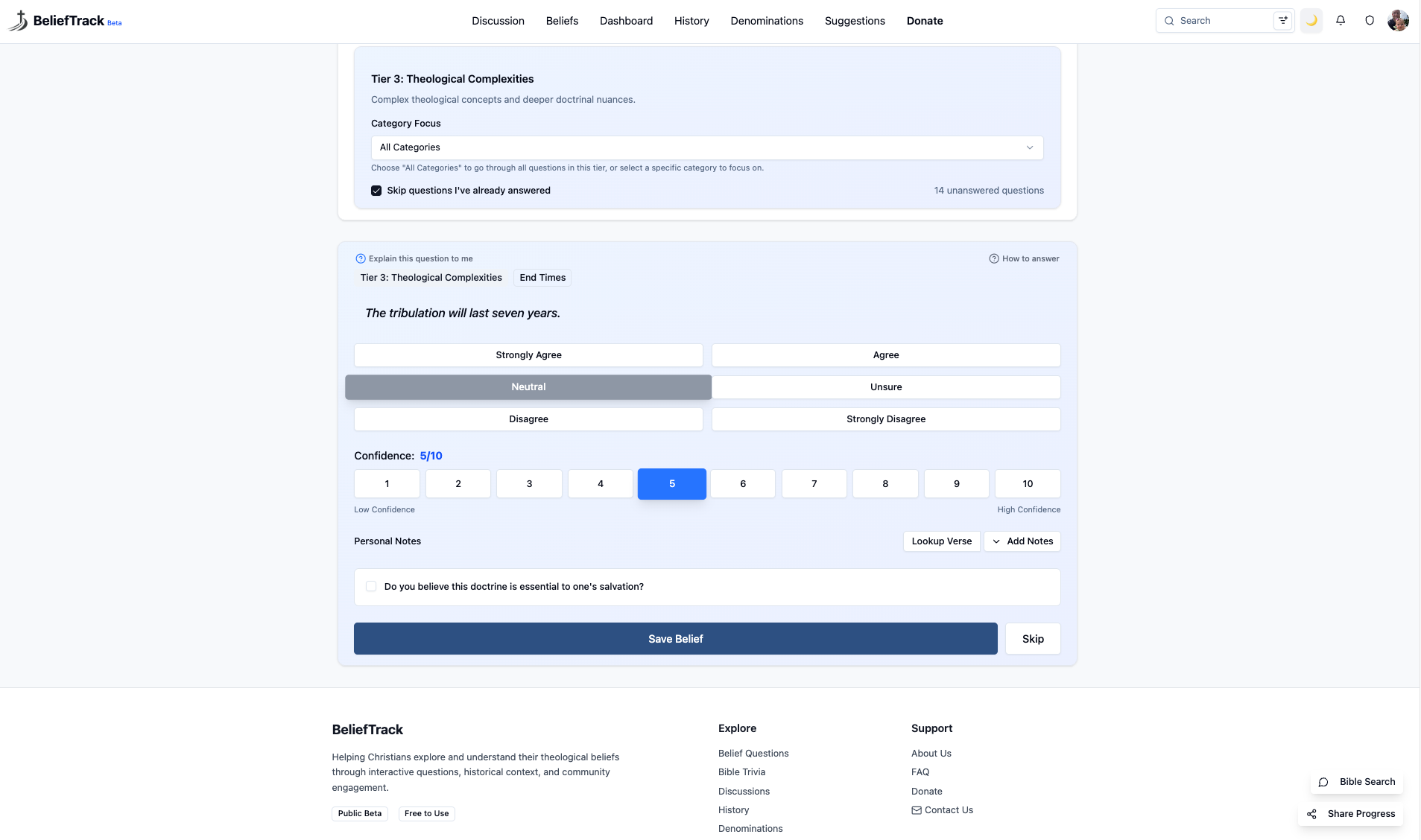BeliefTrack is like a spiritual fitness tracker for your beliefs. It helps you measure, reflect on, and grow in what you believe, while also connecting with others to have meaningful, Christ-centered discussions.