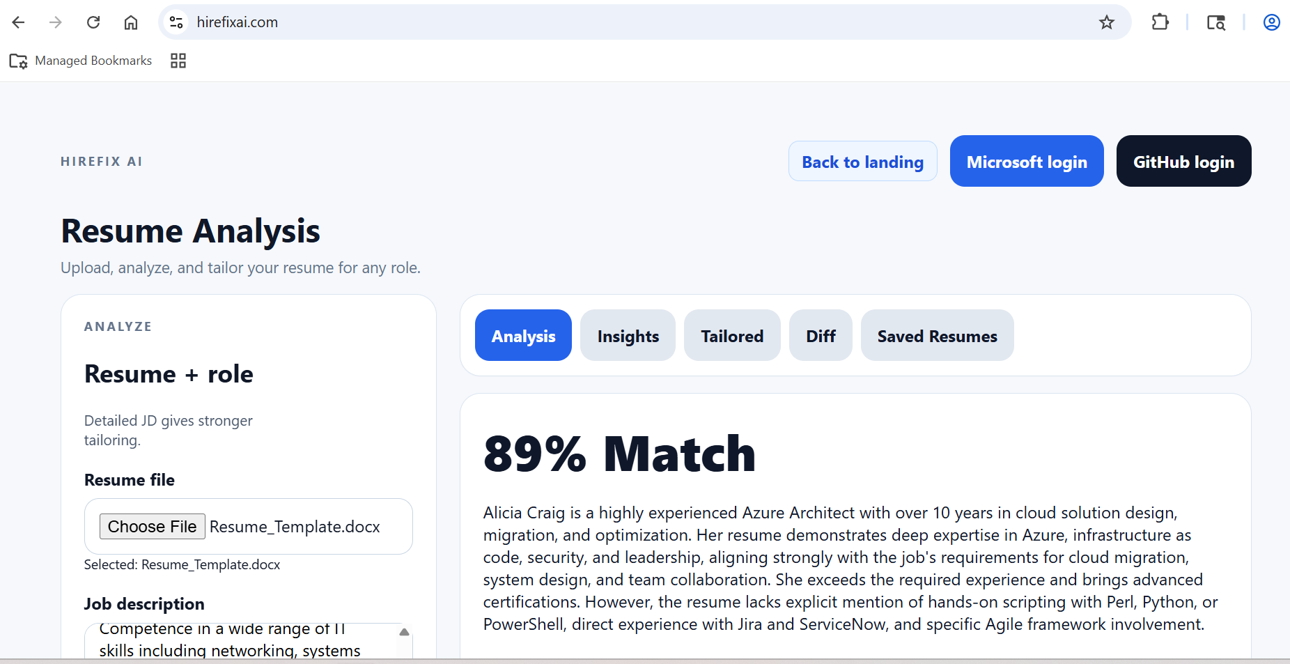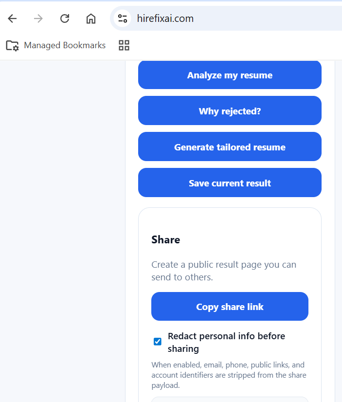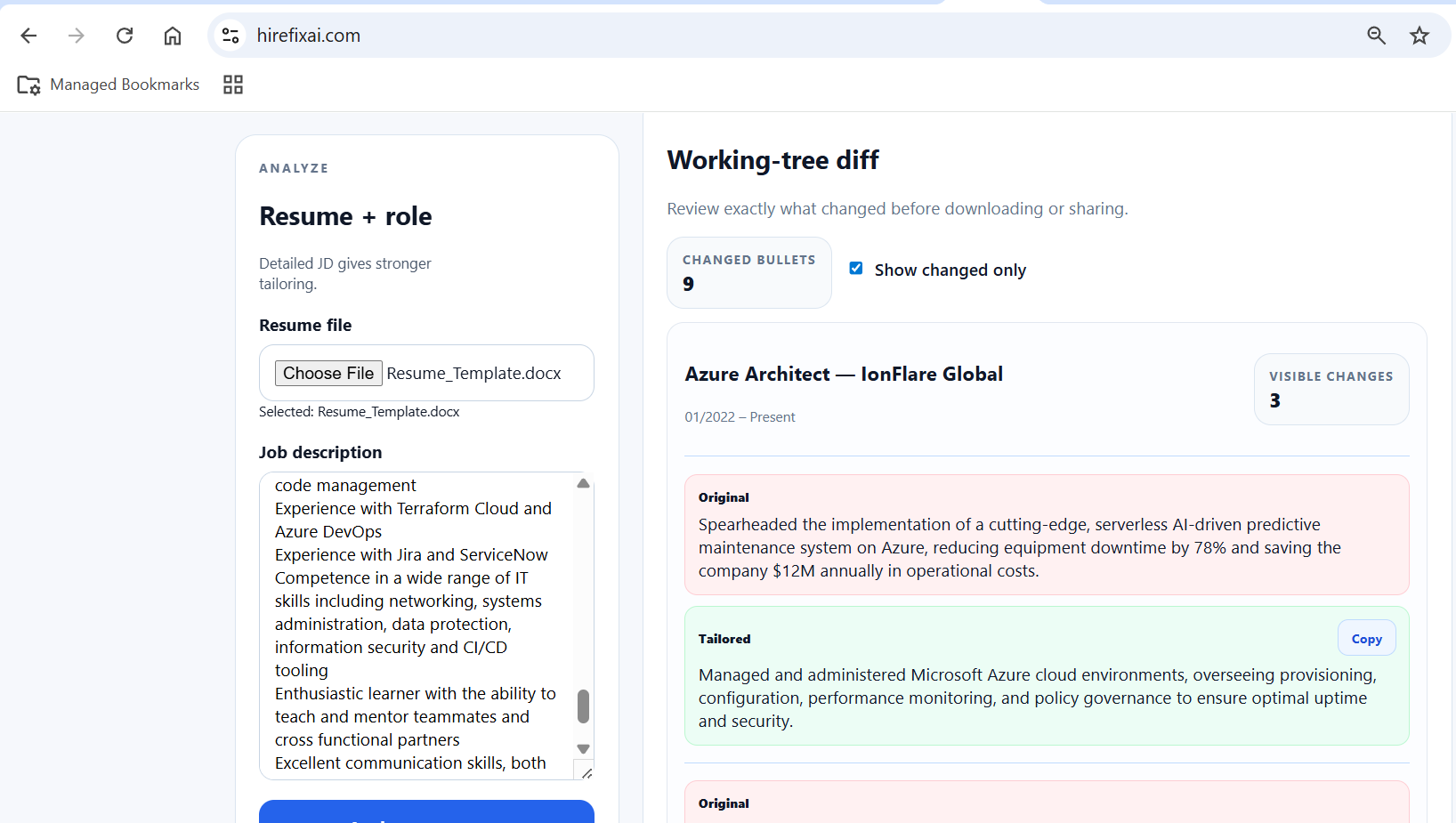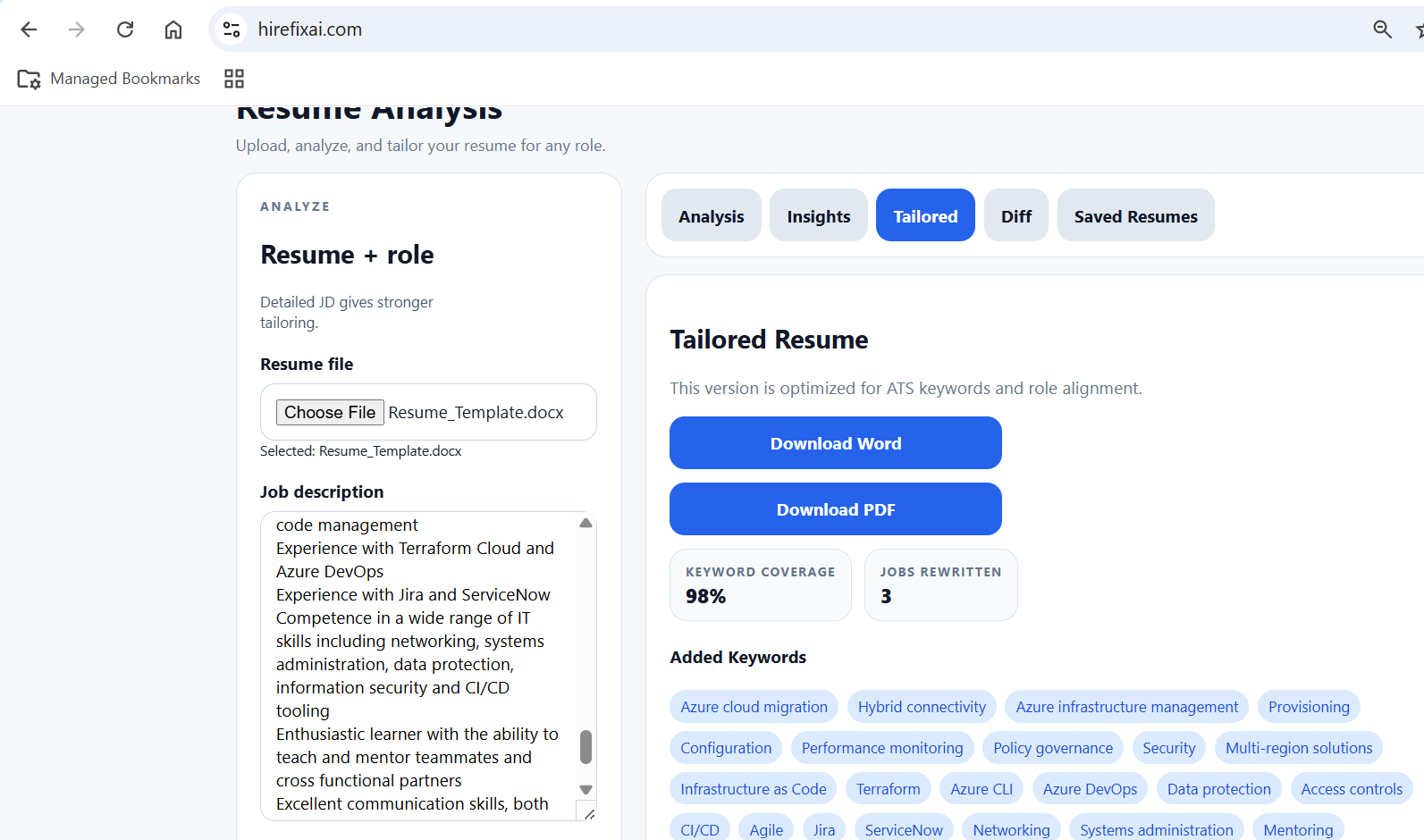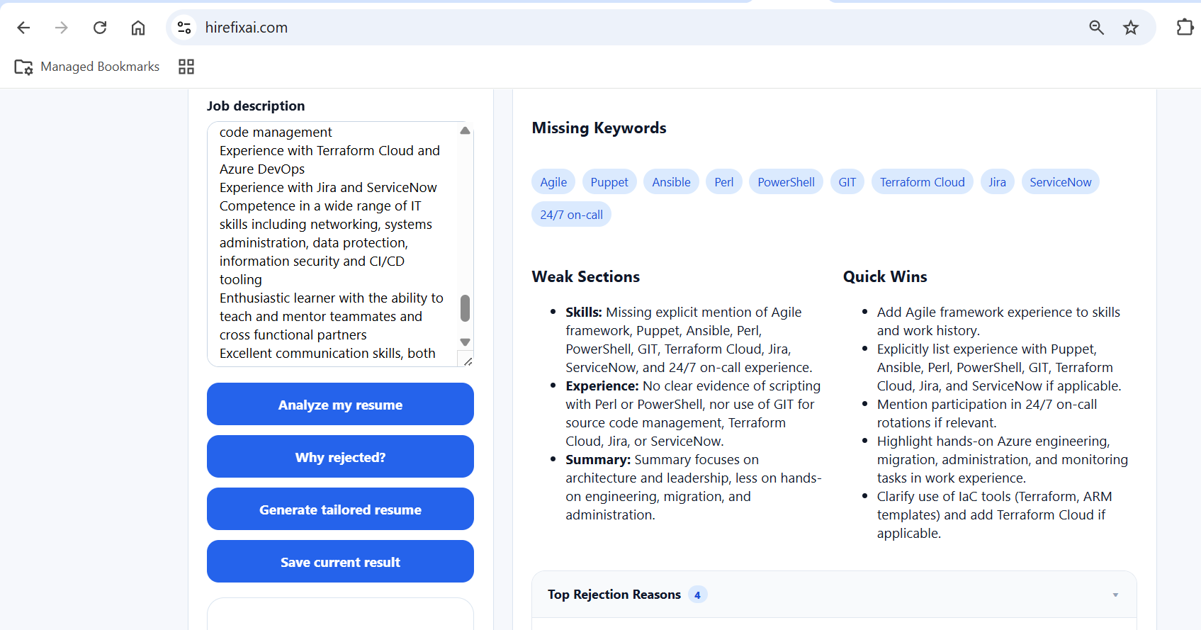 HireFix AI — Fix Why Your Resume Gets Rejected (Not Just Rewrite It) Most resume tools just rewrite your resume. HireFix AI is different. It helps you understand why you're getting rejected — and fixes it. 🔍 What it does 👉 Compare your resume vs job description (line-by-line) 👉 Show missing keywords & skills 👉 Explain rejection risks (ATS + hiring gaps) 👉 Generate a tailored resume for the role 👉 Show a diff of what changed (like Git) 👉 Provide interview questions based on gaps ⚡ Why it’s different Not just AI rewriting — actual JD alignment Shows why you’re not getting interviews Gives actionable fixes, not generic advice Transparent changes (diff view) Works instantly — no signup required 🚀 Try it Upload your resume + paste a job description → get results in seconds 👉 https://www.hirefixai.com (Demo mode available if you don’t want to upload anything) 💡 Built for Job seekers applying to multiple roles People stuck in “no response” loop Anyone trying to beat ATS filters