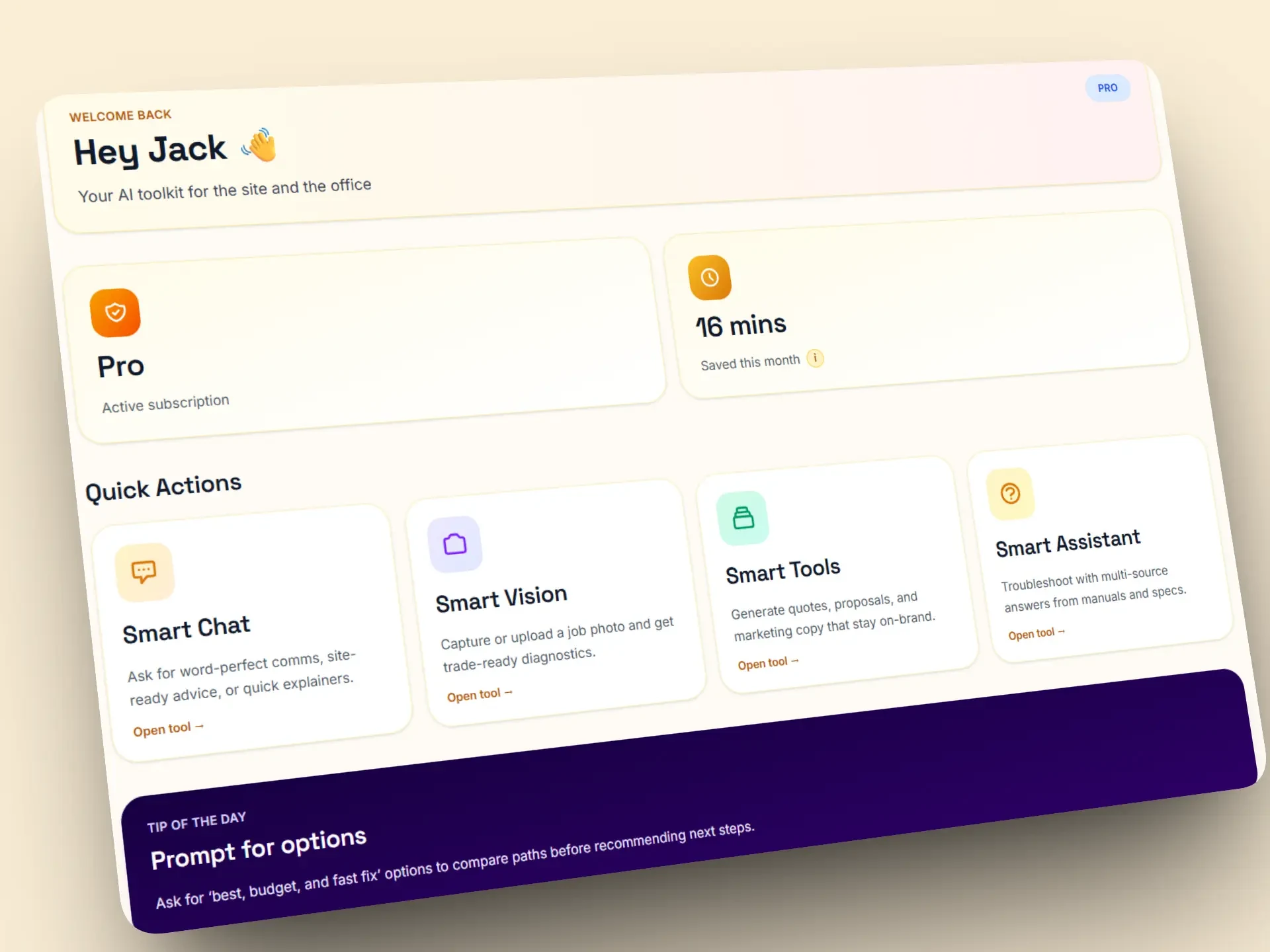 Tradie Assistant is an AI-powered workspace built for tradies, helping them quote faster, handle admin, generate job documents, and get instant answers from manuals and site info. It matters because most tradies lose time and money to paperwork, missed calls, and slow back-office tasks. Tradie Assistant gives them practical tools that save time, reduce hassle, and help them get back on the tools.